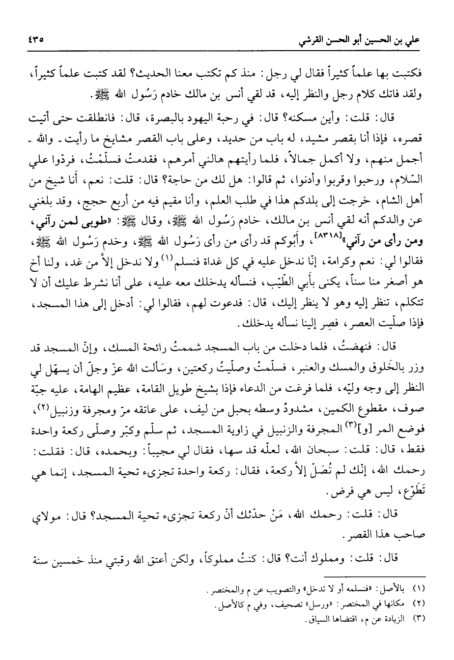 فكتبت بها علما كثيرا فقال لي رجل منذ كم تكتب معنا الحديث لقد كتبت علما كثيرا ولقد فاتك كلام رجل والنظر إليه قد لقي أنس بن مالك خادم رسول الله (صلى الله عليه وسلم) قال قلت وأين مسكنه قال في رحبة اليهود بالبصرة قال فانطلقت حتى أتيت قصره فإذا أنا بقصر مشيد له باب من حديد وعلى باب القصر مشايخ ما رأيت والله أجمل منهم ولا أكمل جمالا فلما رأيتهم هالني أمرهم فقدمت فسلمت فردوا علي السلام ورحبوا وقربوا وأدنوا ثم قالوا هل لك من حاجة قال قلت نعم أنا شيخ من أهل الشام خرجت إلى بلدكم هذا في طلب العلم وأنا مقيم فيه من أربع حجج وقد بلغني عن والدكم أنه لقي أنس بن مالك خادم رسول الله (صلى الله عليه وسلم) وقال (صلى الله عليه وسلم) طوبى لمن رآني ومن رأى من رآني
