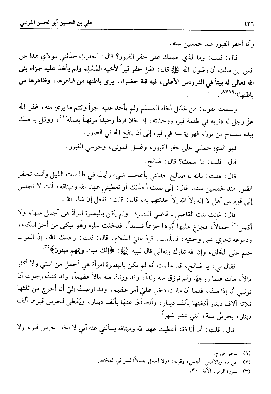 وسمعته يقول من غسل أخاه المسلم ولم يأخذ عليه أجرا وكتم ما يرى منه غفر الله عز وجل له ذنوبه في ظلمة قبره ووحشته إذا خلا فردا وحيدا مرتهنا بعمله (1) ووكل به ملك بيده مصباح من نور فهو يؤنسه في قبره إلى أن ينفخ الله في الصور فهو الذي حملني على حفر القبور وغسل الموتى وحرسي القبور قال قلت ما اسمك قال صالح قال قلت بالله يا صالح حدثني بأعجب شئ رأيت في ظلمات الليل وأنت تحفر القبور منذ خمسين سنة قال إني لست أحدثك أو تعطيني عهد الله وميثاقه أنك لا تجلس إلى قوم من أهل لا إلا إلا الله إلا حدثتهم به قال قلت نفعل إن شاء الله قال ماتت بنت القاضي قاضي البصرة ولم يكن بالبصرة امرأة هي أجمل منها ولا أكمل (2) جمالا فجزع عليها أبوها جزعا شديدا فدخلت عليه وهو يبكي من أحر البكاء ودموعه تجري على وجنتيه فسلمت فرد علي السلام قال قلت رحمك الله إن الموت حتم على الخلق وإن الله تبارك وتعالى قال لنبيه (صلى الله عليه وسلم) " إنك ميت وإنهم ميتون " (3) فقال لي يا صالح قد علمت أنه لم يكن بالبصرة امرأة هي أجمل من ابنتي ولا أكثر مالا مات عنها زوجها ولم ترزق منه ولدا وقد ورثت منه مالا عظيما وقد كنت رجوت أن ترثني أنا إذا مت فلما أن ماتت دخل علي امر عظيم وقد أوصت إلي أن أخرج من ثلثها ثلاثة آلاف دينار أكفنها بألف دينار وأتصدق عنها بألف دينار ويعطى لحرس قبرها ألف دينار يحرس سنة اثني عشرة شهرا قال قلت أما أنا فقد أعطيت عهد الله وميثاقه يسألني عنه أني لا آخذ لحرس قبر