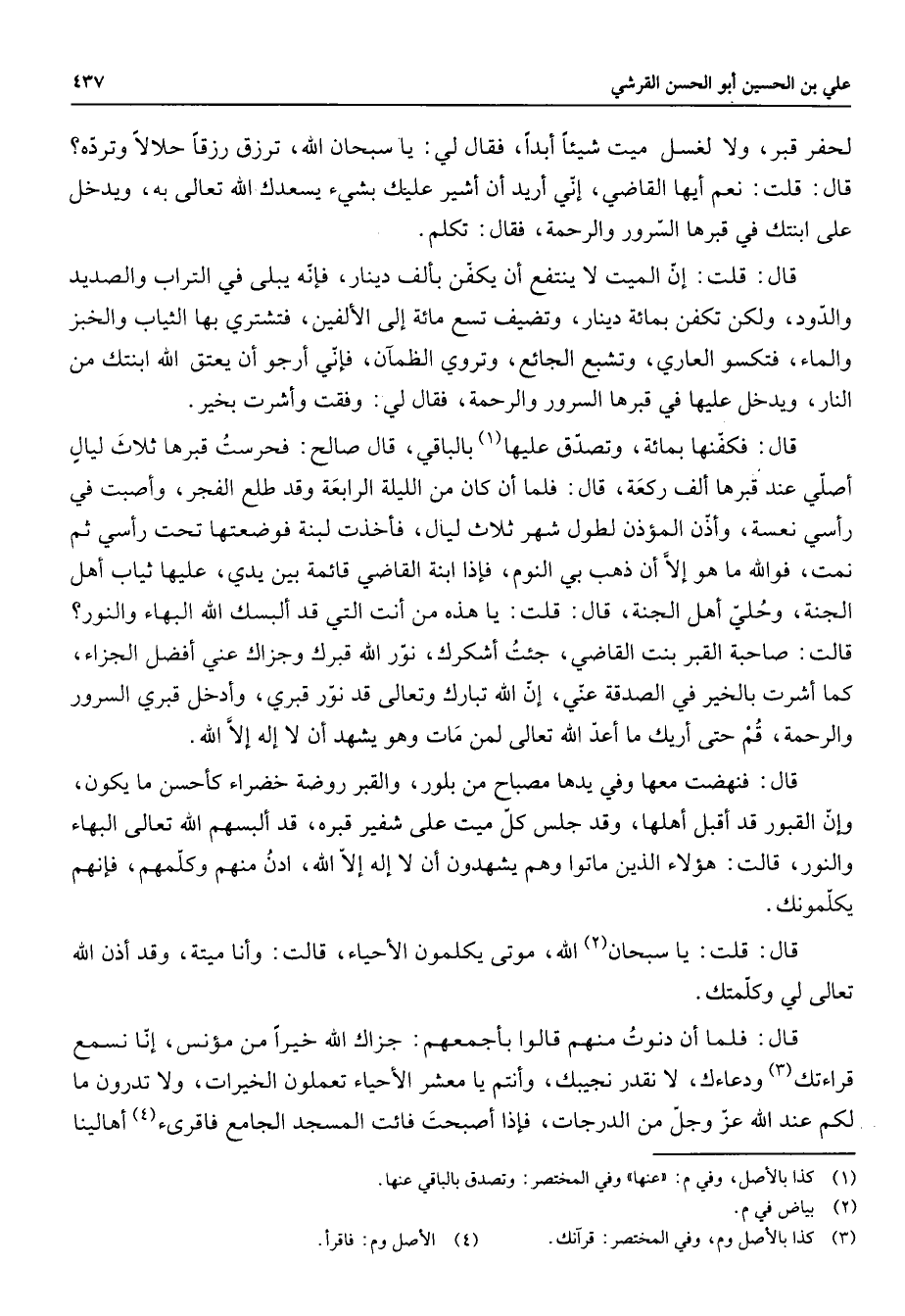 ولا لحفر قبر ولا لغسل ميت شيئا أبدا فقال لي يا سبحان الله ترزق رزقا حلالا وترده قال قلت نعم أيها القاضي أني أريد أن أشير عليك بشئ يسعدك الله تعالى به ويدخل على ابنتك في قبرها السرور والرحمة فقال تكلم قال قلت إن الميت لا ينتفع أن يكفن بألف دينار فإنه يبلى في التراب والصديد والدود ولكن تكفن بمائة دينار وتضيف تسع مائة إلى الألفين فتشتري بها الثياب والخبز والماء فتكسو العاري وتشبع الجائع وتروي الظمآن فإني أرجو أن يعتق الله ابنتك من النار ويدخل عليها في قبرها السرور والرحمة فقال لي وفقت وأشرت بخير قال فكفنها بمائة وتصدق عليها (1) بالباقي قال صالح فحرست قبرها ثلاث ليال أصلي عند قبرها ألف ركعة قال فلما أن كان من الليلة الرابعة وقد طلع الفجر وأصبت في رأسي نعسة وأذن المؤذن لطول شهر ثلاث ليال فأخذت لبنة فوضعتها تحت رأسي ثم نمت فوالله ما هو إلا أن ذهب بي النوم فإذا ابنة القاضي قائمة بين يدي عليها ثياب أهل الجنة وحلي أهل الجنة قال قلت يا هذه من أنت التي قد ألبسك الله البهاء والنور قالت صاحبة القبر بنت القاضي جئت أشكرك نور الله قبرك وجزاك عني أفضل الجزاء كما أشرت بالخير في الصدقة عني إن الله تبارك وتعالى قد نور قبري وأدخل قبري السرور والرحمة قم حتى أريك ما أعد الله تعالى لمن مات وهو يشهد أن لا إله إلا الله قال فنهضت معها وفي يدها مصباح من بلور والقبر روضة خضراء كأحسن ما يكون وإن القبور قد أقبل أهلها وقد جلس كل ميت على شفير قبره قد ألبسهم الله تعالى البهاء والنور قالت هؤلاء الذين ماتوا وهم يشهدون أن لا إله إلا الله ادن منهم وكلمهم فإنهم يكلمونك قال قلت يا سبحان الله (2) موتى يكلمون الأحياء قالت وأنا ميتة وقد أذن الله تعالى لي وكلمتك قال فلما أن دنوت منهم قالوا بأجمعهم جزاك الله خيرا من مؤنس إنا نسمع قراءتك (3) ودعاءك لا نقدر نجيبك وأنتم يا معشر الأحياء تعملون الخيرات ولا تدرون ما لكم عند الله عز وجل من الدرجات فإذا أصبحت فائت المسجد الجامع فاقرئ (4) أهالينا
