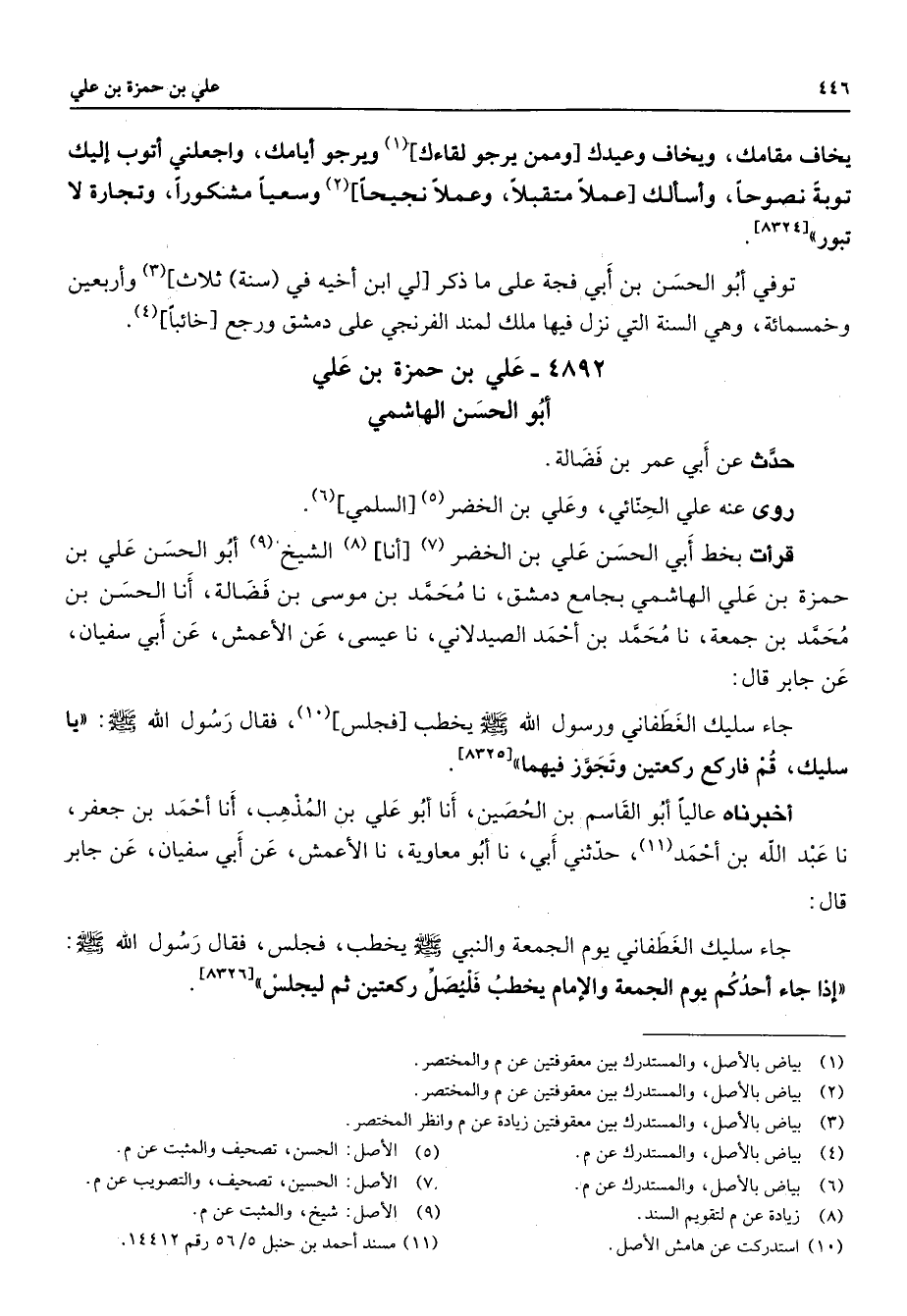 4892 - علي بن حمزة بن علي أبو الحسن الهاشمي حدث عن أبي عمر بن فضالة روى عنه علي الحنائي وعلي بن الخضر (5) السلمي (6) قرأت بخط أبي الحسن علي بن الخضر (7) أنا (8) الشيخ (9) أبو الحسن علي بن حمزة بن علي الهاشمي بجامع دمشق نا محمد بن موسى بن فضالة أنا الحسن بن محمد بن جمعة نا محمد بن أحمد الصيدلاني نا عيسى عن الأعمش عن أبي سفيان عن جابر قال جاء سليك الغطفاني ورسول الله (صلى الله عليه وسلم) يخطب فجلس (10) فقال رسول الله (صلى الله عليه وسلم) يا سليك قم فاركع ركعتين وتجوز فيهما