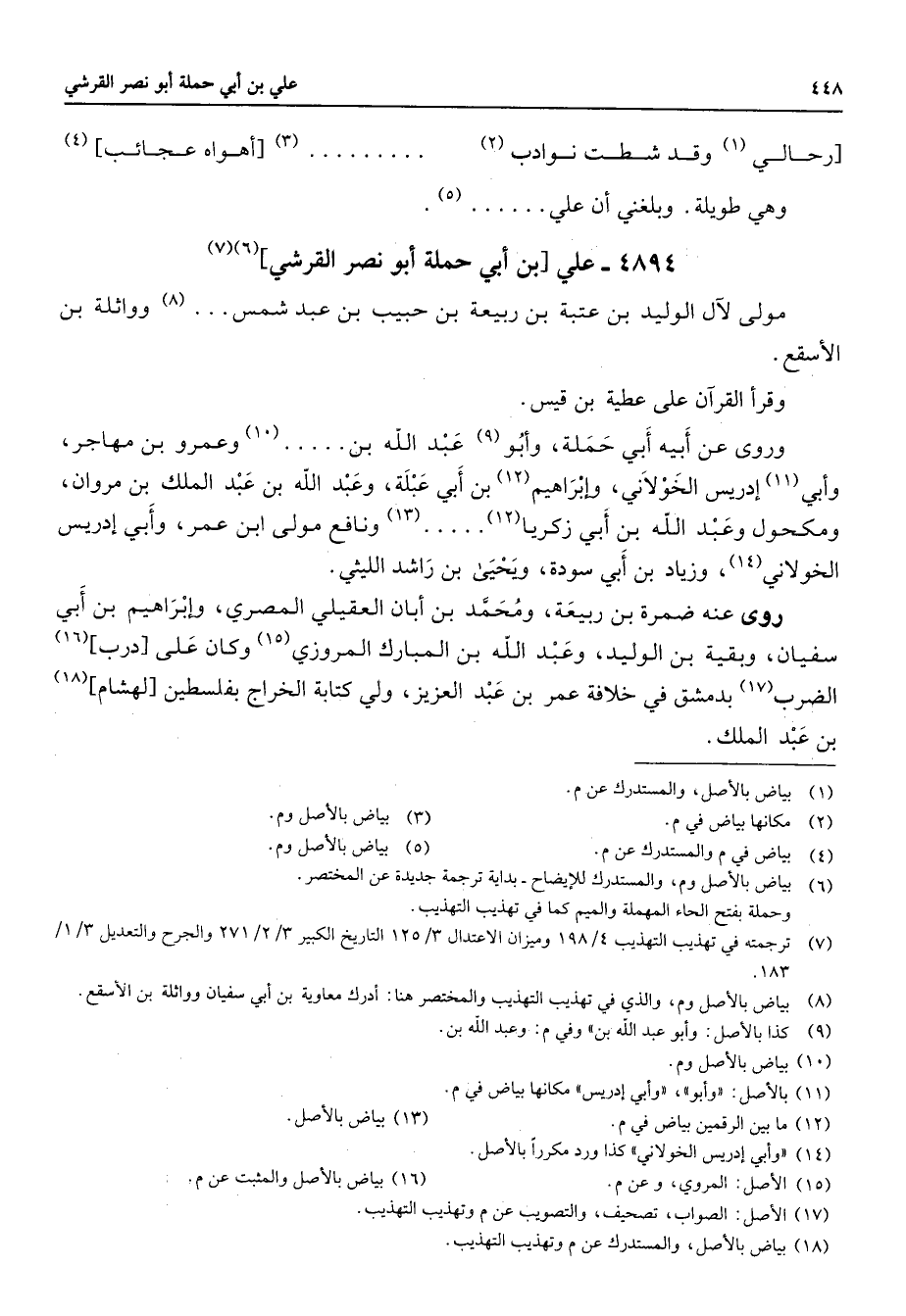 4894 - علي بن أبي حملة أبو نصر القرشي (6) (7) مولى لآل الوليد بن عتبة بن ربيعة بن حبيب بن عبد شمس (8) وواثلة بن الأسقع وقرأ القرآن على عطية بن قيس وروى عن أبيه أبي حملة وأبو (9) عبد الله بن (10) وعمروبن مهاجر وأبي (11) إدريس الخولاني وإبراهيم (12) بن أبي عبلة وعبد الله بن عبد الملك بن مروان ومكحول وعبد الله بن أبي زكريا (12) (13) ونافع مولى ابن عمر وأبي إدريس الخولاني (14) وزياد بن أبي سودة ويحيى بن راشد الليثي روى عنه ضمرة بن ربيعة ومحمد بن أبان العقيلي المصري وإبراهيم بن أبي سفيان وبقية بن الوليد وعبد الله بن المبارك المروزي (15) وكان على درب (16) الضرب (17) بدمشق في خلافة عمر بن عبد العزيز ولي كتابة الخراج بفلسطين لهشام (18) بن عبد الملك