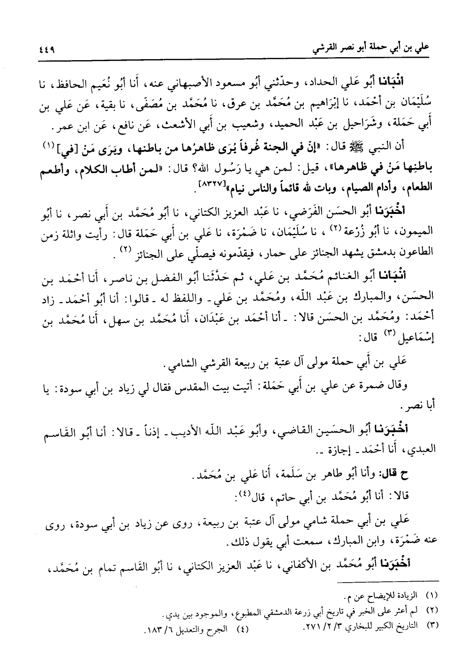 [8327] أخبرنا أبو الحسن الفرضي نا عبد العزيز الكتاني نا أبو محمد بن ابي نصر نا أبو الميمون نا أبو زرعة (2) نا سليمان نا ضمرة نا علي بن أبي حملة قال رأيت واثلة زمن الطاعون بدمشق يشهد الجنائز على حمار فيقدمونه فيصلي على الجنائز (2) أنبأنا أبو الغنائم محمد بن علي ثم حدثنا أبو الفضل بن ناصر أنا أحمد بن الحسن والمبارك بن عبد الله ومحمد بن علي واللفظ له قالوا أنا أبو أحمد زاد أحمد ومحمد بن الحسن قالا أنا أحمد بن عبدان أنا محمد بن سهل أنا محمد بن إسماعيل (3) قال علي بن أبي حملة مولى آل عتبة بن ربيعة القرشي الشامي وقال ضمرة عن علي بن أبي حملة أتيت بيت المقدس فقال لي زياد بن أبي سودة يا أبا نصر أخبرنا أبو الحسين القاضي وأبو عبد الله الأديب إذنا قالا أنا أبو القاسم العبدي أنا أحمد إجازة ح قال وأنا أبو طاهر بن سلمة أنا علي بن محمد قالا أنا أبو محمد بن أبي حاتم قال (4) علي بن أبي حملة شامي مولى آل عتبة بن ربيعة روى عن زياد بن أبي سودة روى عنه ضمرة وابن المبارك سمعت أبي يقول ذلك أخبرنا أبو محمد بن الأكفاني نا عبد العزيز الكتاني نا أبو القاسم تمام بن محمد