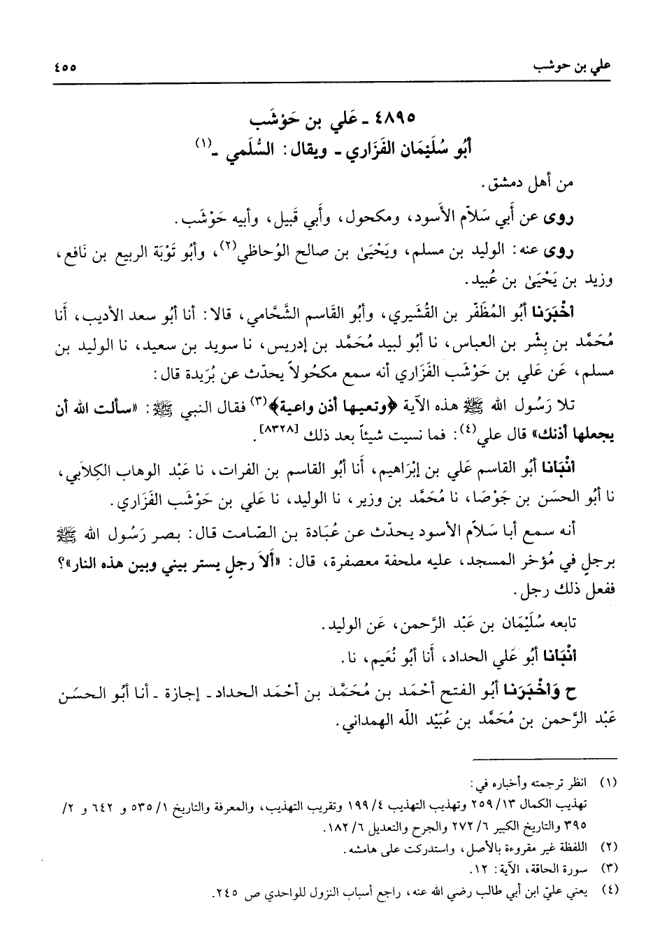 4895 - علي بن حوشب أبو سليمان الفزاري ويقال السلمي (1) من أهل دمشق روى عن أبي سلام الأسود ومكحول وأبي قبيل وأبيه حوشب روى عنه الوليد بن مسلم ويحيى بن صالح الوحاظي (2) وأبو توبة الربيع بن نافع وزيد بن يحيى بن عبيد أخبرنا أبو المظفر بن القشيري وأبو القاسم الشحامي قالا أنا أبو سعد الأديب أنا م حمد بن بشر بن العباس نا أبو لبيد محمد بن إدريس نا سويد بن سعيد نا الوليد بن مسلم عن علي بن حوشب الفزاري أنه سمع مكحولا يحدث عن بريدة قال تلا رسول الله (صلى الله عليه وسلم) هذه الآية " وتعيها أذن واعية " (3) فقال النبي (صلى الله عليه وسلم) سألت الله أن يجعلها أذنك قال علي (4) : فما نسيت شيئا بعد ذلك