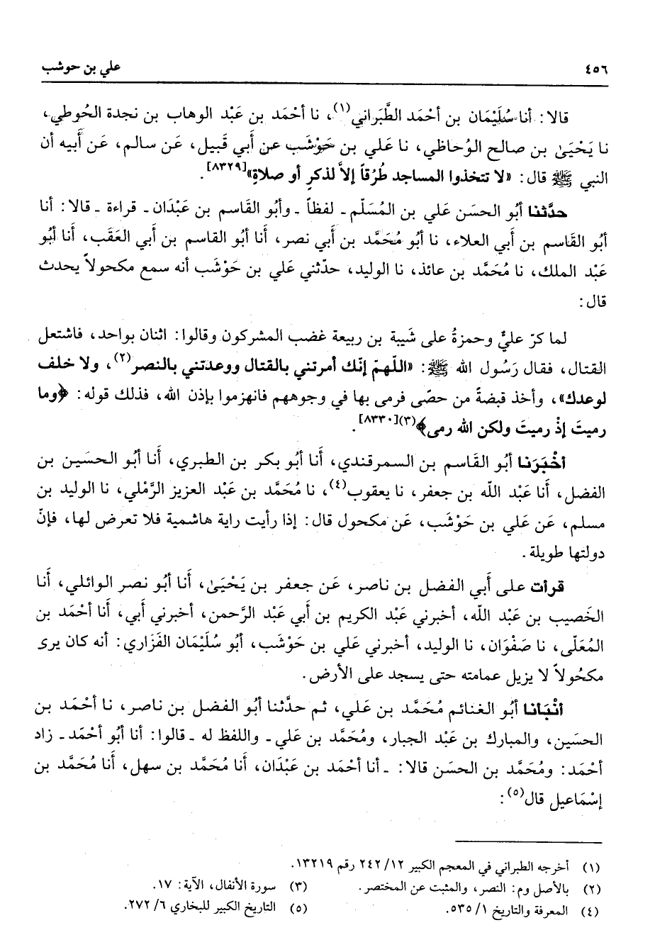 [8329] حدثنا أبو الحسن علي بن المسلم لفظا وأبو القاسم بن عبدان قراءة قالا أنا أبو القاسم بن أبي العلاء نا أبو محمد بن أبي نصر أنا أبو القاسم بن أبي العقب أنا أبو عبد الملك نا محمد بن عائذ نا الوليد حدثني علي بن حوشب أنه سمع مكحولا يحدث قال لما كر علي وحمزة على شيبة بن ربيعة غضب المشركون وقالوا اثنان بواحد فاشتعل القتال فقال رسول الله (صلى الله عليه وسلم) اللهم إنك أمرتني بالقتال ووعدتني بالنصر (2) ولا خلف لوعدك وأخذ قبضة من حصى فرمى بها في وجوههم فانهزموا بإذن الله فذلك قوله " وما رميت إذ رميت ولكن الله رمى " (3)