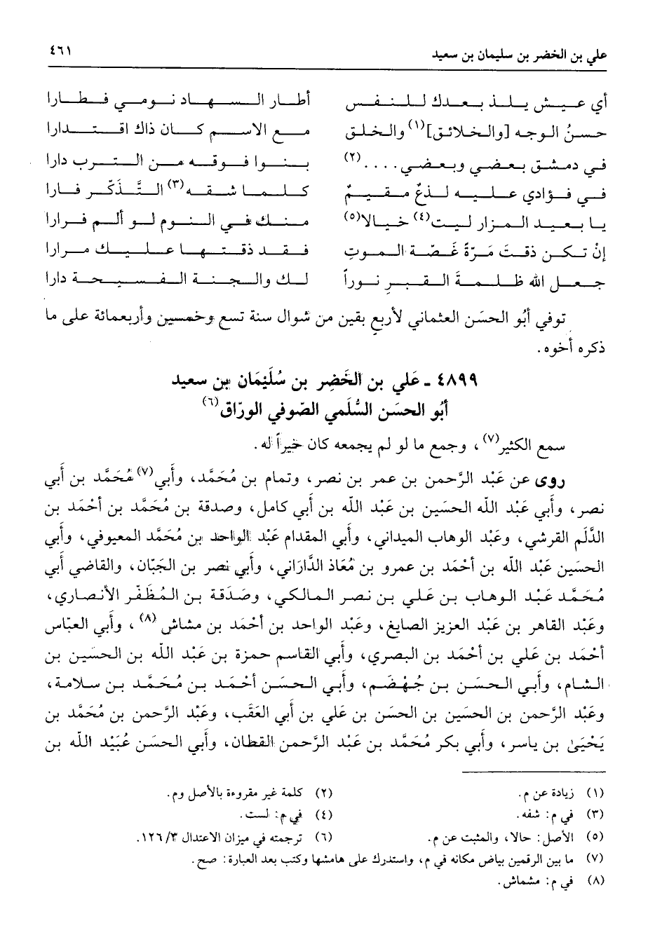 4899 - علي بن الخضر بن سليمان بن سعيد أبو الحسن السلمي الصوفي الوراق (6) سمع الكثير (7) وجمع ما لو لم يجمعه كان خيرا له روى عن عبد الرحمن بن عمر بن نصر وتمام بن محمد وأبي (7) محمد بن أبي نصر وأبي عبد الله الحسين بن عبد الله بن أبي كامل وصدقة بن محمد بن أحمد بن الدلم القرشي وعبد الوهاب الميداني وأبي المقدام عبد الواحد بن محمد المعيوفي وأبي الحسين عبد الله بن أحمد بن عمرو بن معاذ الداراني وأبي نصر بن الجبان والقاضي أبي محمد عبد الوهاب بن علي بن نصر المالكي وصدقة بن المظفر الأنصاري وعبد القاهر بن عبد العزيز الصايغ وعبد الواحد بن أحمد بن مشاش (8) وأبي العباس أحمد بن علي بن أحمد بن البصري وأبي القاسم حمزة بن عبد الله بن الحسين بن الشام وأبي الحسن بن جهضم وأبي الحسن أحمد بن محمد بن سلامة وعبد الرحمن بن الحسين بن الحسن بن علي بن أبي العقب وعبد الرحمن بن محمد بن يحيى بن ياسر وأبي بكر محمد بن عبد الرحمن القطان وأبي الحسن عبيد الله بن