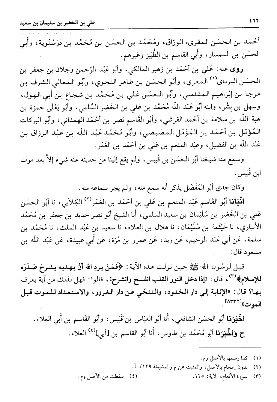أحمد بن الحسن المقرئ الوراق ومحمد بن الحسن بن محمد بن درستوية وأبي الحسن بن السمسار وأبي القاسم بن الطبيز وغيرهم روى عنه علي بن أحمد بن زهير المالكي وأبو عبد الرحمن وجلان بن جعفر بن الحسن البرناي (1) المعري وأبو الحسن بن طاهر النحوي وأبو المعالي الشرف بن مرجا بن إبراهيم المقدسي وأبو الحسن علي بن محمد بن شجاع بن أبي الهول وسهل بن بشر وابنه أبو عبد الله محمد بن علي بن الخضر السلمي وأبو يعلى حمزة بن هبة الله بن سلامة بن أحمد القرشي وأبو القاسم نصر بن أحمد الهمداني وأبو البركات المؤمل بن أحمد بن المؤمل المصيصي وأبو محمد عبد الله بن عبد الرزاق بن عبد الله بن الفضيل وعبد المنعم بن علي بن أحمد بن الغمر وسمع منه شيخنا أبو الحسن بن قبيس ولم يقع إلينا من حديثه عنه شئ إلا بعد موت ابن قبيس وكان جدي أبو المفضل يذكر أنه سمع منه ولم يجر سماعه منه أنبأنا أبو القاسم عبد المنعم بن علي بن أحمد بن الغمر (2) الكلابي نا أبو الحسن علي بن الخضر بن سيلمان بن سعيد السلمي أنا الشيخ أبو نصر حديد بن جعفر بن محمد الأنباري نا خيثمة بن سليمان نا هلال بن العلاء نا سعيد بن عبد الملك نا محمد بن سلمة عن أبي عبد الرحيم عن زيد عن عمرو بن مرة عن أبي عبيدة عن عبد الله بن مسعود قال قيل لرسول الله (صلى الله عليه وسلم) حين نزلت هذه الآية " فمن يرد الله أن يهديه يشرح صدره للإسلام (3) " قال إذا دخل النور القلب انفسح وانشرح