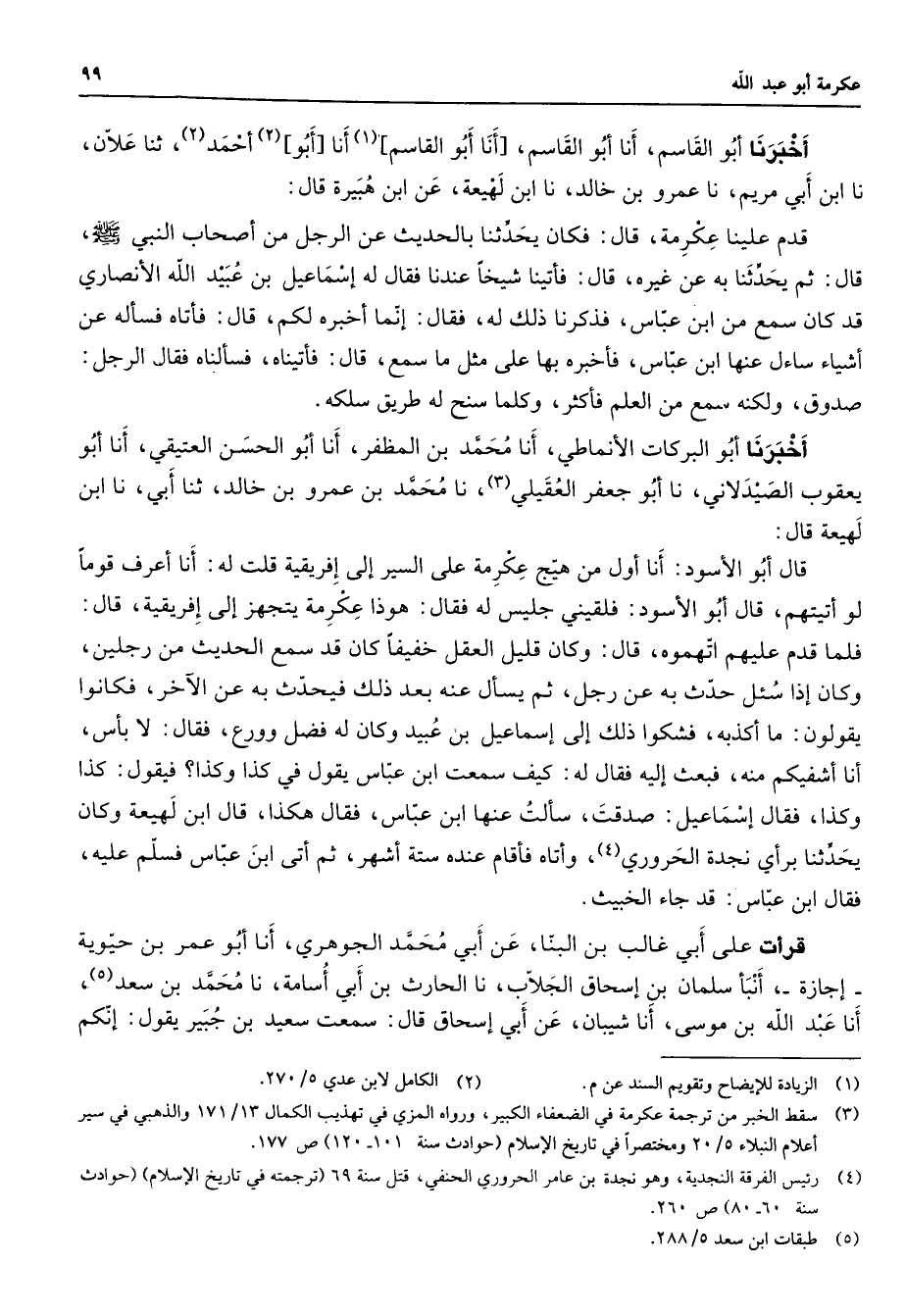 أخبرنا أبو القاسم أنا أبو القاسم أنا أبو القاسم (1) أنا أبو (2) أحمد ثنا علان نا ابن أبي مريم نا عمرو بن خالد نا ابن لهيعة عن ابن هبيرة قال قدم علينا عكرمة قال فكان يحدثنا بالحديث عن الرجل من أصحاب النبي (صلى الله عليه وسلم) قال ثم يحدثنا به عن غيره قال فأتينا شيخا عندنا فقال له إسماعيل بن عبيد الله الأنصاري قد كان سمع من ابن عباس فذكرنا ذلك له فقال إنما أخبره لكم قال فأتاه فسأله عن أشياء ساءل عنها ابن عباس فأخبره بها على مثل ما سمع قال فأتيناه فسألناه فقال الرجل صدوق ولكنه سمع من العلم فأكثر وكلما سنح له طريق سلكه أخبرنا أبو البركات الأنماطي أنا محمد بن المظفر أنا أبو الحسن العتيقي أنا أبو يعقوب الصيدلاني نا أبو جعفر العقيلي (3) نا محمد بن عمرو بن خالد ثنا أبي نا ابن لهيعة قال قال أبو الأسود أنا أول من هيج عكرمة على السير إلى إفريقية قلت له أنا أعرف قوما لو أتيتهم قال أبو الأسود فلقيني جليس له فقال هوذا عكرمة يتجهز إلى إفريقية قال فلما قدم عليهم اتهموه قال وكان قليل العقل خفيفا كان قد سمع الحديث من رجلين وكان إذا سئل حدث به عن رجل ثم يسأل عنه بعد ذلك فيحدث به عن الآخر فكانوا يقولون ما أكذبه فشكوا ذلك إلى إسماعيل بن عبيد وكان له فضل وورع فقال لا بأس أنا أشفيكم منه فبعث إليه فقال له كيف سمعت ابن عباس يقول في كذا وكذا فيقول كذا وكذا فقال إسماعيل صدقت سألت عنها ابن عباس فقال هكذا قال ابن لهيعة وكان يحدثنا برأي نجدة الحروري (4) وأتاه فأقام عنده ستة أشهر ثم أتى ابن عباس فسلم عليه فقال ابن عباس قد جاء الخبيث قرأت على أبي غالب بن البنا عن أبي محمد الجوهري أنا أبو عمر بن حيوية إجازة أنبأ سلمان بن إسحاق الجلاب نا الحارث بن أبي أسامة نا محمد بن سعد (5) أنا عبد الله بن موسى أنا شيبان عن أبي إسحاق قال سمعت سعيد بن جبير يقول إنكم