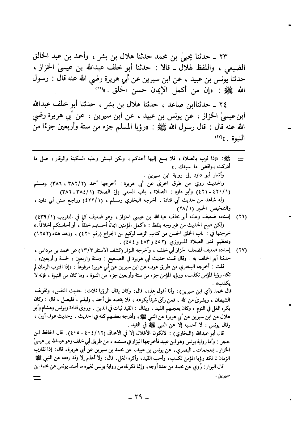 24 - حَدثنَا ابْن صاعد حَدثنَا هِلَال بن بشر حَدثنَا أَبُو خلف عبد الله بن عِيسَى الخزاز عَن يُونُس بن عبيد عَن ابْن سِيرِين عَن أبي هُرَيْرَة رَضِي الله عَنهُ قَالَ قَالَ رَسُول الله صلى الله عَلَيْهِ وَسلم رُؤْيا الْمُسلم جُزْء من سِتَّة وَأَرْبَعين جُزْءا من النُّبُوَّة