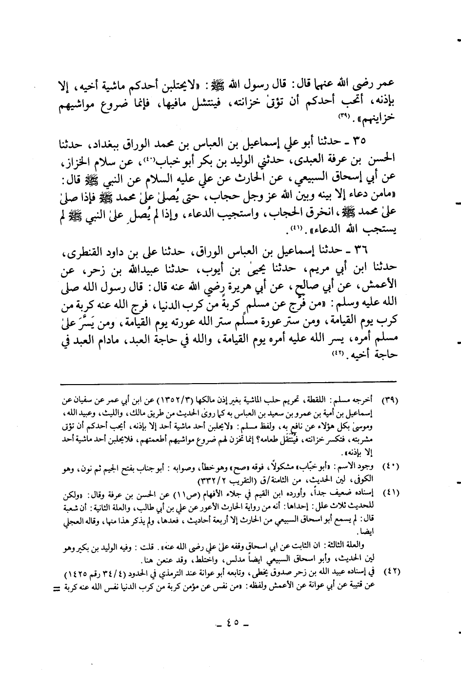 36 - حَدثنَا إِسْمَاعِيل بن الْعَبَّاس الْوراق حَدثنَا عَليّ بن دَاوُد القنطرى حَدثنَا ابْن أبي مَرْيَم حَدثنَا يحيى بن أَيُّوب حَدثنَا عبيد الله بن زحر عَن الْأَعْمَش عَن أبي صَالح عَن أبي هُرَيْرَة رَضِي الله عَنهُ قَالَ قَالَ رَسُول الله صلى الله عَلَيْهِ وَسلم من فرج عَن مُسلم كربَة من كرب الدُّنْيَا فرج الله عَنهُ كربَة من كرب يَوْم الْقِيَامَة وَمن ستر عَورَة مُسلم ستر الله عَوْرَته يَوْم الْقِيَامَة وَمن يسر على مُسلم أمره يسر الله عَلَيْهِ أمره يَوْم الْقِيَامَة وَالله فِي حَاجَة العَبْد مَا دَامَ العَبْد فِي حَاجَة أَخِيه
