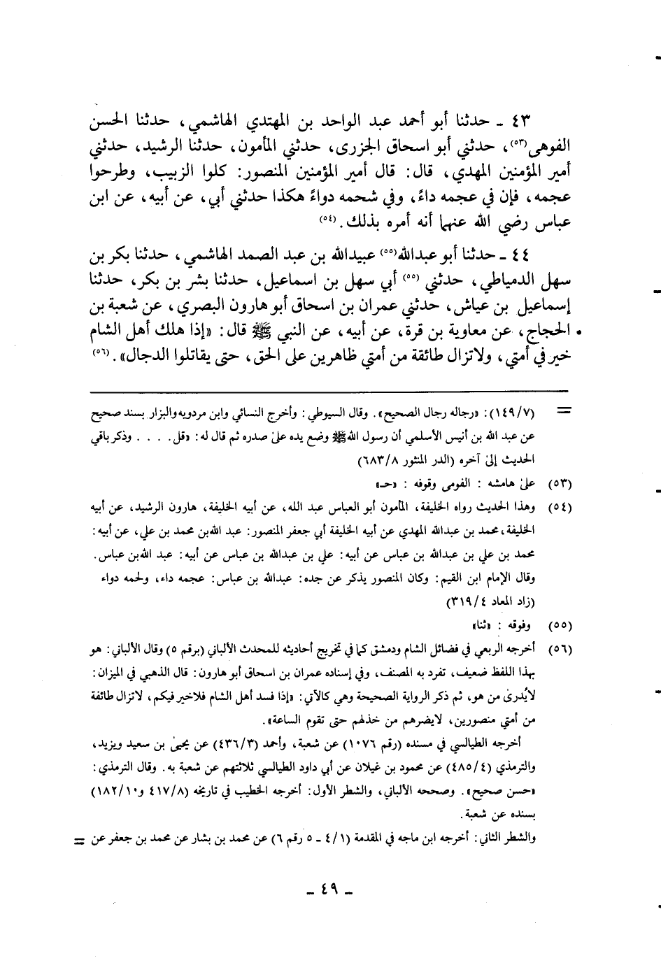 43 - حَدثنَا أَبُو أَحْمد عبد الْوَاحِد بن الْمُهْتَدي الْهَاشِمِي حَدثنَا الْحسن الفوهي حَدثنِي أَبُو اسحاق الْجَزرِي حَدثنِي الْمَأْمُون حَدثنَا الرشيد حَدثنِي أَمِير الْمُؤمنِينَ الْمهْدي قَالَ قَالَ أَمِير الْمُؤمنِينَ الْمَنْصُور كلوا الزَّبِيب وطرحوا عجمه فَإِن فِي عجمه دَاء وَفِي شحمه دَوَاء هَكَذَا حَدثنِي أبي عَن أَبِيه عَن ابْن عَبَّاس رَضِي الله عَنْهُمَا أَنه أمره بذلك