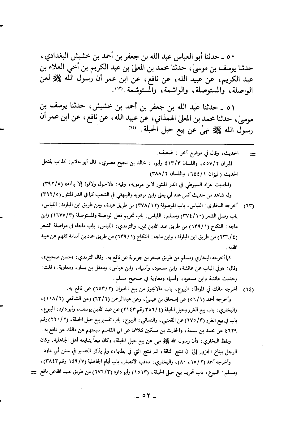 51 - حَدثنَا عبد الله بن جَعْفَر بن أَحْمد بن خشيش حَدثنَا يُوسُف بن مُوسَى حَدثنَا مُحَمَّد بن الْمُعَلَّى الهمذاني عَن عبيد الله عَن نَافِع عَن ابْن عمر أَن رَسُول الله صلى الله عَلَيْهِ وَسلم نهى عَن بيع حَبل الحبلة