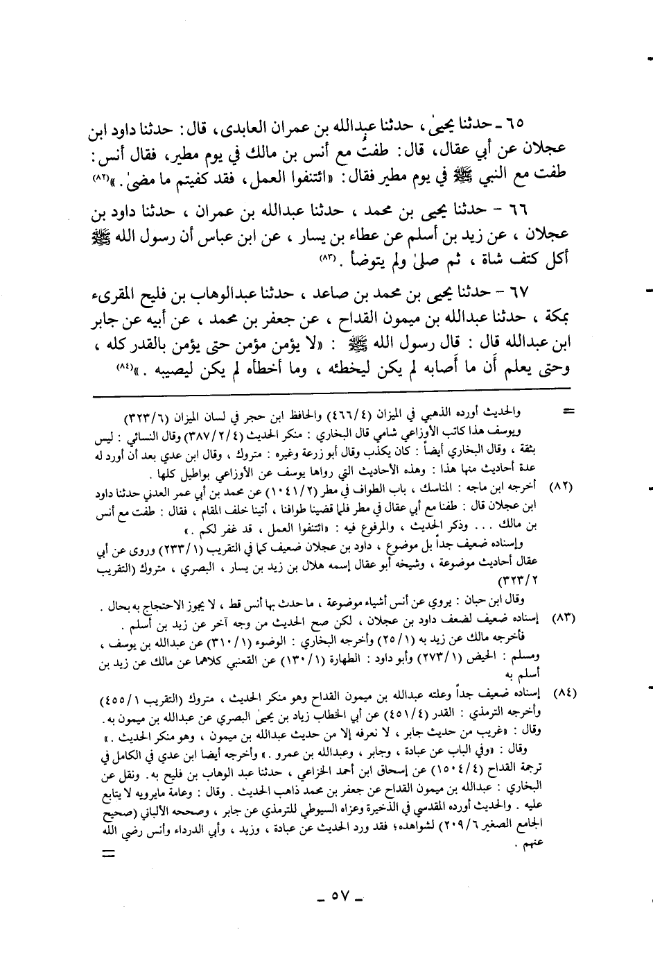 67 - حَدثنَا يحيى بن مُحَمَّد بن صاعد حَدثنَا عبد الْوَهَّاب بن فليح الْمُقْرِئ بِمَكَّة حَدثنَا عبد الله بن مَيْمُون القداح عَن جَعْفَر بن مُحَمَّد عَن أَبِيه عَن جَابر ابْن عبد الله قَالَ قَالَ رَسُول الله صلى الله عَلَيْهِ وَسلم لَا يُؤمن مُؤمن حَتَّى يُؤمن بِالْقدرِ كُله وَحَتَّى يعلم أَن مَا أَصَابَهُ لم يكن ليخطئه وَمَا أخطأه لم يكن ليصيبه