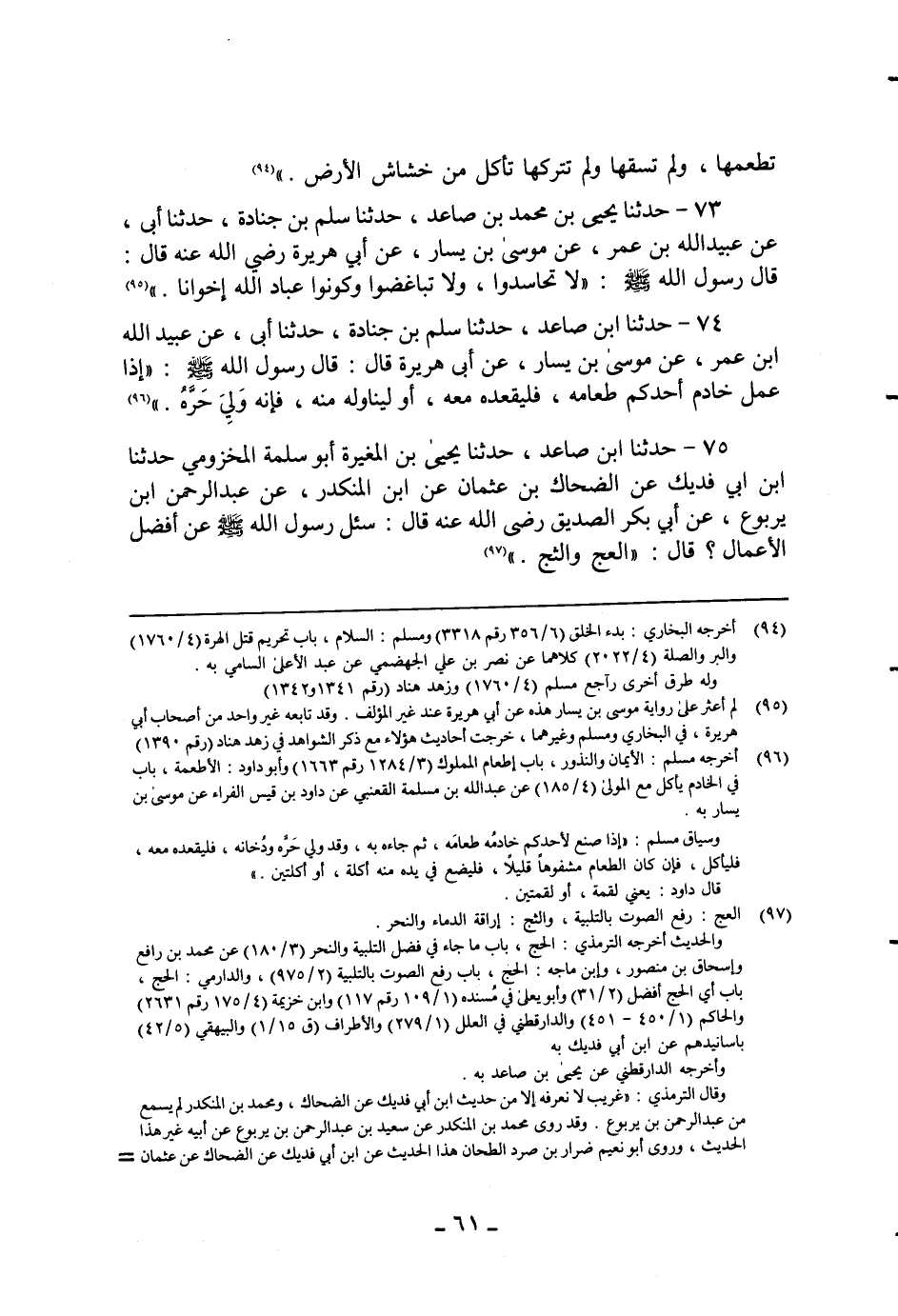 73 - حَدثنَا يحيى بن مُحَمَّد بن صاعد حَدثنَا سلم بن جُنَادَة حَدثنَا أبي عَن عبيد الله بن عمر عَن مُوسَى بن يسَار عَن أبي هُرَيْرَة رَضِي الله عَنهُ قَالَ قَالَ رَسُول الله صلى الله عَلَيْهِ وَسلم لَا تَحَاسَدُوا وَلَا تباغضوا وَكُونُوا عباد الله إخْوَانًا