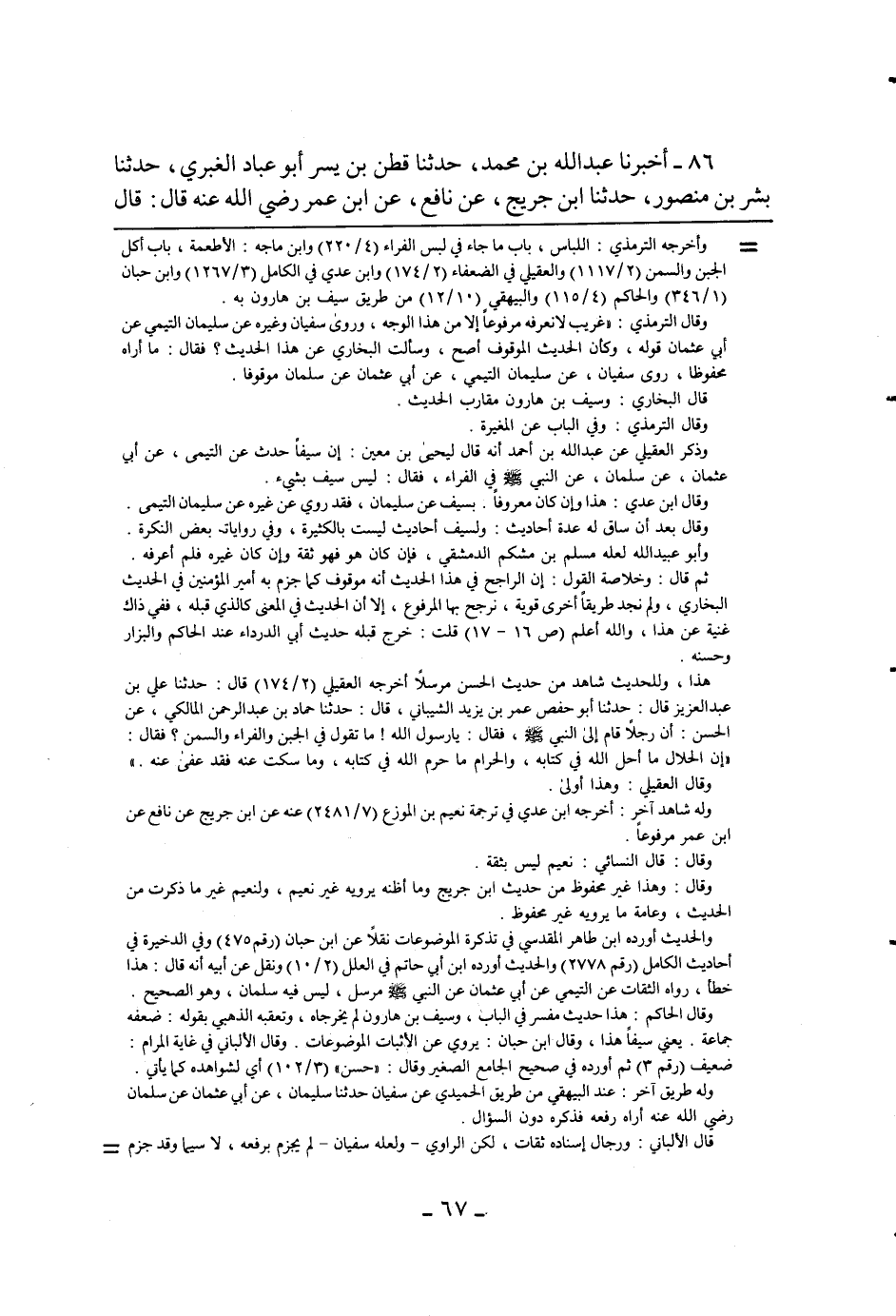 86 - أخبرنَا عبد الله بن مُحَمَّد حَدثنَا قطن بن يسر أَبُو عباد الغبري حَدثنَا بشر بن مَنْصُور حَدثنَا ابْن جريج عَن نَافِع عَن ابْن عمر رَضِي الله عَنهُ قَالَ قَالَ