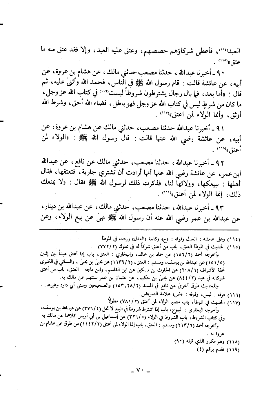 90 - أخبرنَا عبد الله حَدثنَا مُصعب حَدثنِي مَالك عَن هِشَام بن عُرْوَة عَن أَبِيه عَن عَائِشَة قَالَت قَامَ رَسُول الله صلى الله عَلَيْهِ وَسلم فِي النَّاس فَحَمدَ الله وَأثْنى عَلَيْهِ ثمَّ قَالَ أما بعد فَمَا بَال رجال يشترطون شُرُوطًا لَيست فِي كتاب الله عز وَجل مَا كَانَ من شَرط لَيْسَ فِي كتاب الله عز وَجل فَهُوَ بَاطِل قَضَاء الله أَحَق وَشرط الله أوثق وأنما الْوَلَاء لمن أعتق