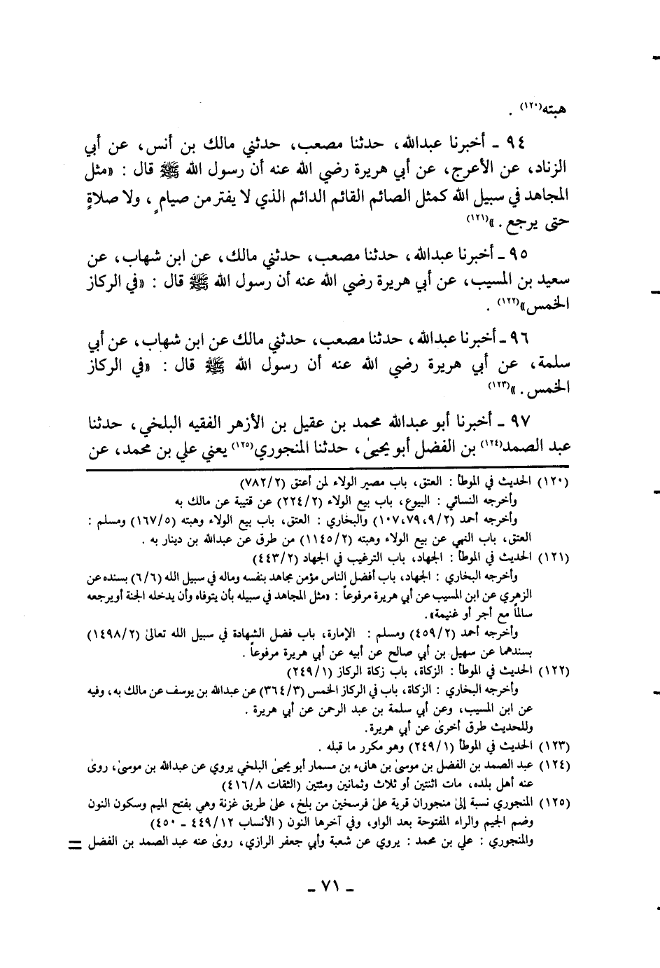 94 - أخبرنَا عبد الله حَدثنَا مُصعب حَدثنِي مَالك بن أنس عَن أبي الزِّنَاد عَن الْأَعْرَج عَن أبي هُرَيْرَة رَضِي الله عَنهُ أَن رَسُول الله صلى الله عَلَيْهِ وَسلم قَالَ مثل الْمُجَاهِد فِي سَبِيل الله كَمثل الصَّائِم الْقَائِم الدَّائِم الَّذِي لَا يفتر من صِيَام وَلَا صَلَاة حَتَّى يرجع
