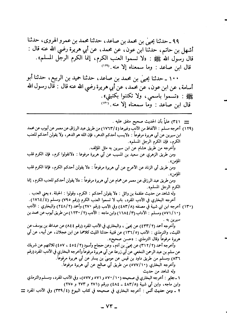 99 - حَدثنَا يحيى بن مُحَمَّد بن صاعد حَدثنَا مُحَمَّد بن عَمْرو الهروى حَدثنَا أشهل بن حَاتِم حَدثنَا ابْن عون عَن مُحَمَّد عَن أبي هُرَيْرَة رَضِي الله عَنهُ قَالَ قَالَ رَسُول الله صلى الله عَلَيْهِ وَسلم لَا تسموا الْعِنَب الْكَرم إِنَّمَا الْكَرم الرجل الْمُسلم قَالَ ابْن صاعد وَمَا سمعناه إِلَّا مِنْهُ