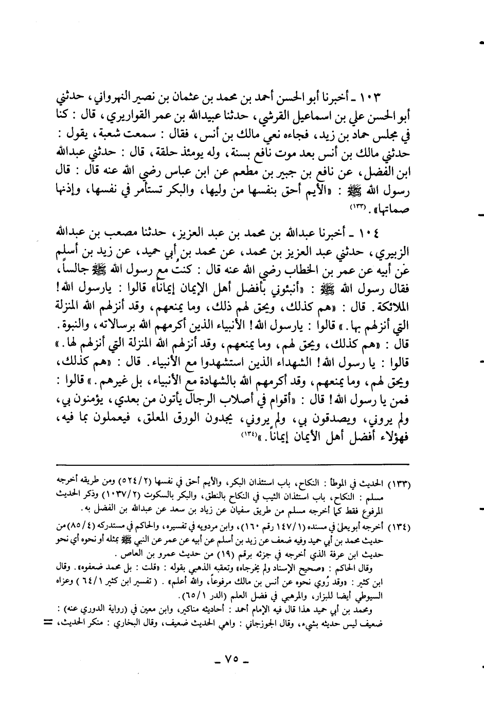 104 - أخبرنَا عبد الله بن مُحَمَّد بن عبد الْعَزِيز حَدثنَا مُصعب بن عبد الله الزبيرِي حَدثنِي عبد الْعَزِيز بن مُحَمَّد عَن مُحَمَّد بن أبي حميد عَن زيد بن أسلم عَن أَبِيه عَن عمر بن الْخطاب رَضِي الله عَنهُ قَالَ كنت مَعَ رَسُول الله صلى الله عَلَيْهِ وَسلم جَالِسا فَقَالَ رَسُول الله صلى الله عَلَيْهِ وَسلم أنبئوني بِأَفْضَل أهل الْإِيمَان إِيمَانًا قَالُوا يَا رَسُول الله الْمَلَائِكَة قَالَ هم كَذَلِك ويحق لَهُم ذَلِك وَمَا يمنعهُم وَقد أنزلهم الله الْمنزلَة الَّتِي أنزلهم بهَا قَالُوا يَا رَسُول الله الْأَنْبِيَاء الَّذين أكْرمهم الله بِرِسَالَاتِهِ والنبوة قَالَ هم كَذَلِك ويحق لَهُم وَمَا يمنعهُم وَقد أنزلهم الله الْمنزلَة الَّتِي أنزلهم لَهَا قَالُوا يَا رَسُول الله الشُّهَدَاء الَّذين اسْتشْهدُوا مَعَ الْأَنْبِيَاء قَالَ هم كَذَلِك ويحق لَهُم وَمَا يمنعهُم وَقد أكْرمهم الله بِالشَّهَادَةِ مَعَ الْأَنْبِيَاء بل غَيرهم قَالُوا فَمن يَا رَسُول الله قَالَ أَقوام فِي أصلاب الرِّجَال يأْتونَ من بعدِي يُؤمنُونَ بِي وَلم يروني ويصدقون بِي وَلم يروني يَجدونَ الْوَرق الْمُعَلق فيعملون بِمَا فِيهِ فَهَؤُلَاءِ أفضل أهل الْأَيْمَان إِيمَانًا