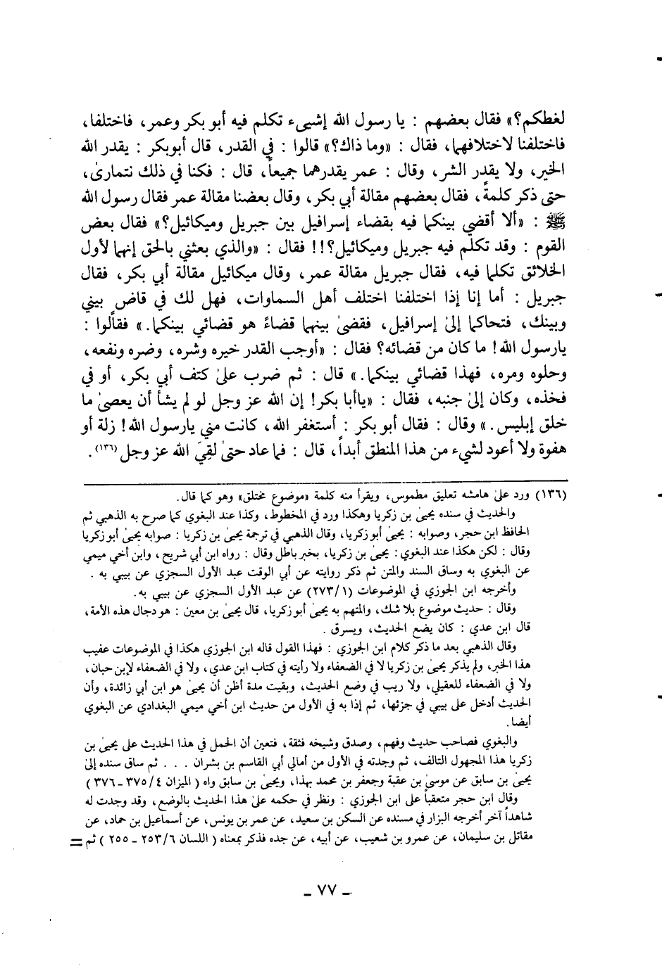 لغطكم فَقَالَ بَعضهم يَا رَسُول الله إشيء تكلم فِيهِ أَبُو بكر وَعمر فاختلفا فاختلفنا لاختلافهما فَقَالَ وَمَا ذَاك قَالُوا فِي الْقدر قَالَ أَبُو بكر يقدر الله الْخَيْر وَلَا يقدر الشَّرّ وَقَالَ عمر يقدرهما جَمِيعًا قَالَ فَكُنَّا فِي ذَلِك نتمارى حَتَّى ذكر كلمة فَقَالَ بَعضهم مقَالَة أبي بكر وَقَالَ بَعْضنَا مقَالَة عمر فَقَالَ رَسُول الله صلى الله عَلَيْهِ وَسلم أَلا أَقْْضِي بَيْنكُمَا فِيهِ بِقَضَاء إسْرَافيل بَين جِبْرِيل وَمِيكَائِيل فَقَالَ بعض الْقَوْم وَقد تكلم فِيهِ جِبْرِيل وَمِيكَائِيل فَقَالَ وَالَّذِي بَعَثَنِي بِالْحَقِّ إنَّهُمَا لأوّل الْخَلَائق تكلما فِيهِ فَقَالَ جِبْرِيل مقَالَة عمر وَقَالَ مِيكَائِيل مقَالَة أبي بكر فَقَالَ جِبْرِيل أما إِنَّا إِذا اخْتَلَفْنَا اخْتلف أهل السَّمَاوَات فَهَل لَك فِي قَاض بيني وَبَيْنك فتحاكما إِلَى إسْرَافيل فَقضى بَينهمَا قَضَاء هُوَ قضائي بَيْنكُمَا فَقَالُوا يَا رَسُول الله مَا كَانَ من قَضَائِهِ فَقَالَ أوجب الْقدر خَيره وشره وضره ونفعه وحلوه ومره فَهَذَا قضائي بَيْنكُمَا قَالَ ثمَّ ضرب على كتف أبي بكر أَو فِي فَخذه وَكَانَ إِلَى جنبه فَقَالَ يَا أَبَا بكر إِن الله عز وَجل لَو لم يَشَأْ أَن يعْصى مَا خلق إِبْلِيس وَقَالَ فَقَالَ أَبُو بكر أسْتَغْفر الله كَانَت مني يَا رَسُول الله زلَّة أَو هفوة وَلَا أَعُود لشَيْء من هَذَا الْمنطق أبدا قَالَ فَمَا عَاد حَتَّى لَقِي الله عز وَجل