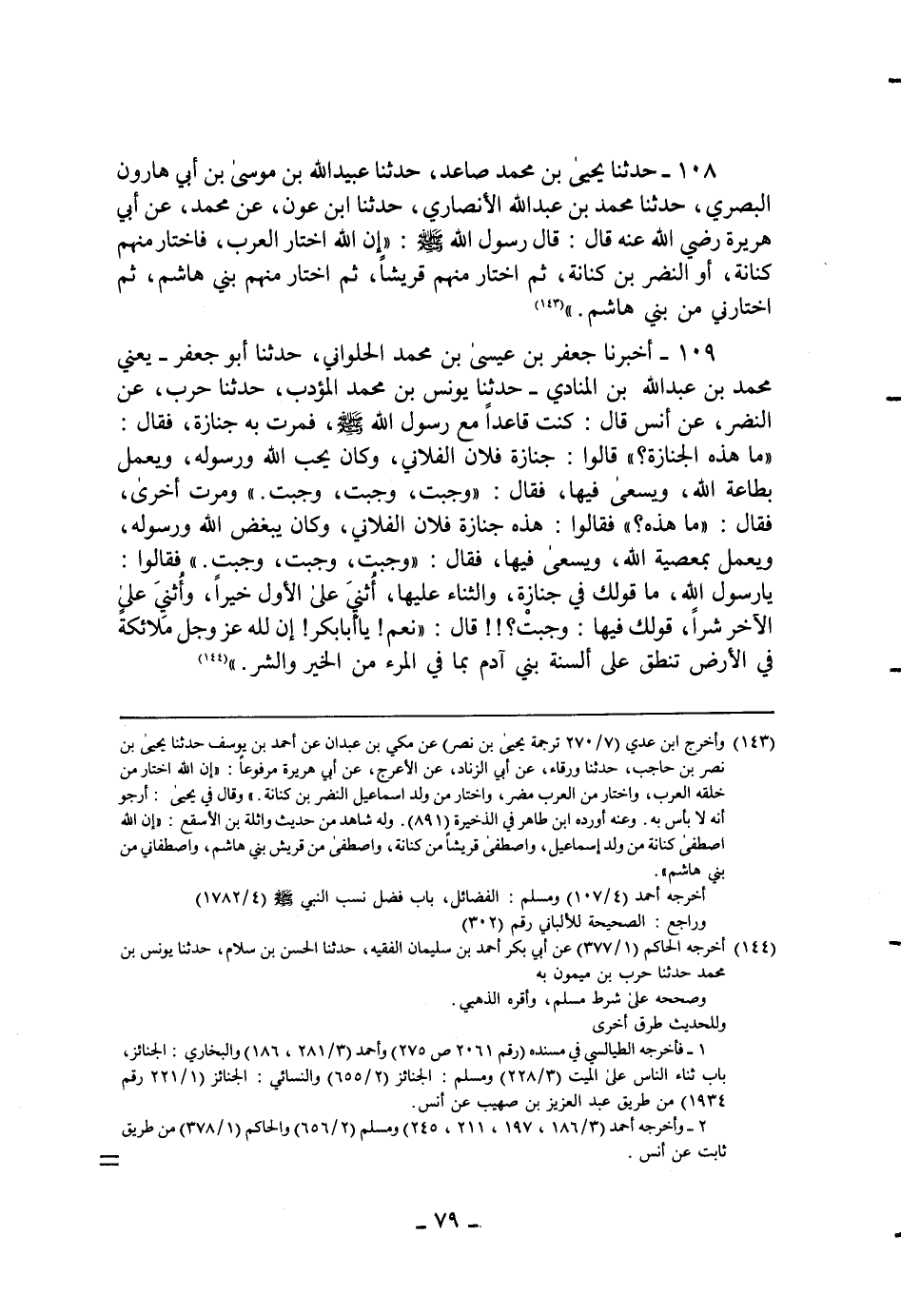 108 - حَدثنَا يحيى بن مُحَمَّد صاعد حَدثنَا عبيد الله بن مُوسَى بن أبي هَارُون الْبَصْرِيّ حَدثنَا مُحَمَّد بن عبد الله الْأنْصَارِيّ حَدثنَا ابْن عون عَن مُحَمَّد عَن أبي هُرَيْرَة رَضِي الله عَنهُ قَالَ قَالَ رَسُول الله صلى الله عَلَيْهِ وَسلم إِن الله اخْتَار الْعَرَب فَاخْتَارَ مِنْهُم كنَانَة أَو النَّضر بن كنَانَة ثمَّ اخْتَار مِنْهُم قُريْشًا ثمَّ اخْتَار مِنْهُم بني هَاشم ثمَّ اختارني من بني هَاشم