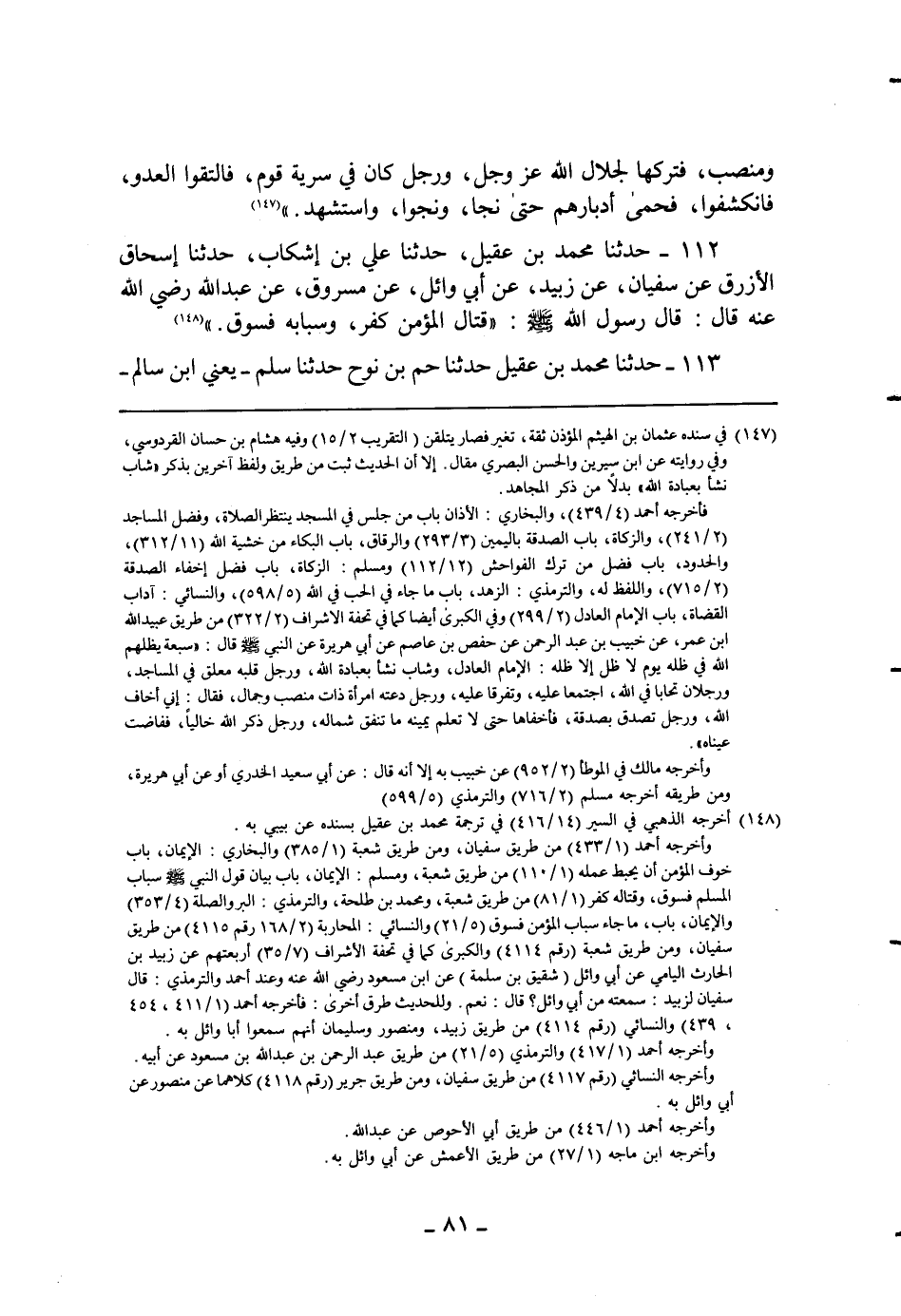 112 - حَدثنَا مُحَمَّد بن عقيل حَدثنَا عَليّ بن إشكاب حَدثنَا إِسْحَاق الْأَزْرَق عَن سُفْيَان عَن زبيد عَن أبي وَائِل عَن مَسْرُوق عَن عبد الله رَضِي الله عَنهُ قَالَ قَالَ رَسُول الله صلى الله عَلَيْهِ وَسلم قتال الْمُؤمن كفر وسبابه فسوق