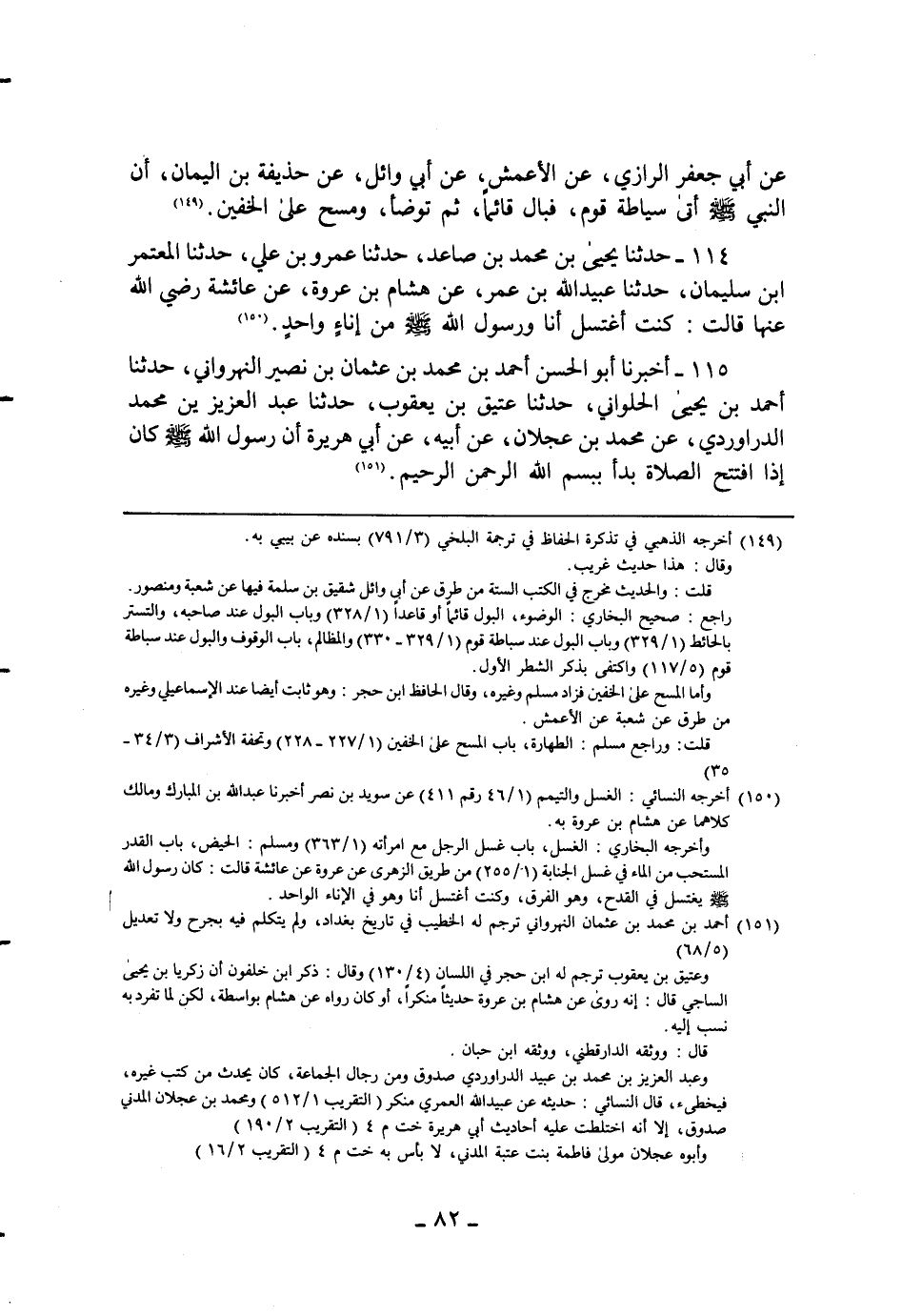 عَن أبي جَعْفَر الرَّازِيّ عَن الْأَعْمَش عَن أبي وَائِل عَن حُذَيْفَة بن الْيَمَان أَن النَّبِي صلى الله عَلَيْهِ وَسلم أَتَى سياطة قوم فَبَال قَائِما ثمَّ تَوَضَّأ وَمسح على الْخُفَّيْنِ