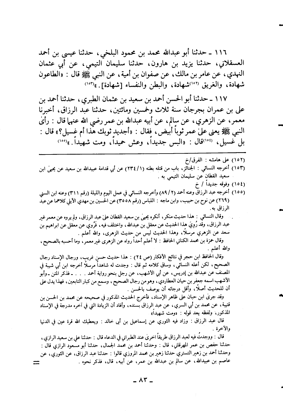 117 - حَدثنَا أَبُو الْحسن أَحْمد بن سعيد بن عُثْمَان الطَّبَرِيّ حَدثنَا أَحْمد بن عَليّ بن عمرَان بجرجان سنة ثَلَاث وَخمسين وَمِائَتَيْنِ حَدثنَا عبد الرَّزَّاق أخبرنَا معمر عَن الزُّهْرِيّ عَن سَالم عَن أَبِيه عبد الله بن عمر رَضِي الله عَنْهُمَا قَالَ رأى النَّبِي صلى الله عَلَيْهِ وَسلم يَعْنِي على عمر ثوبا أَبيض فَقَالَ أجديد ثَوْبك هَذَا أم غسيل قَالَ بل غسيل قَالَ البس جَدِيدا وعش حميدا ومت شَهِيدا
