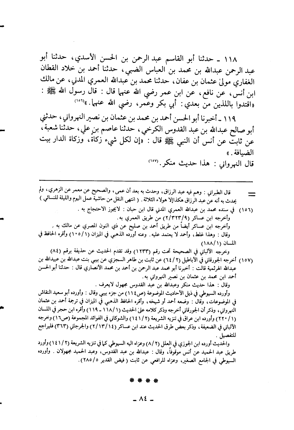 119 - أخبرنَا أَبُو الْحسن أَحْمد بن مُحَمَّد بن عُثْمَان بن نصير النهرواني حَدثنِي أَبُو صَالح عبد الله بن عبد القدوس الْكَرْخِي حَدثنَا عَاصِم بن عَليّ حَدثنَا شُعْبَة عَن ثَابت عَن أنس أَن النَّبِي صلى الله عَلَيْهِ وَسلم قَالَ إِن لكل شَيْء زَكَاة وَزَكَاة الدَّار بَيت الضِّيَافَة قَالَ النهرواني هَذَا حَدِيث مُنكر