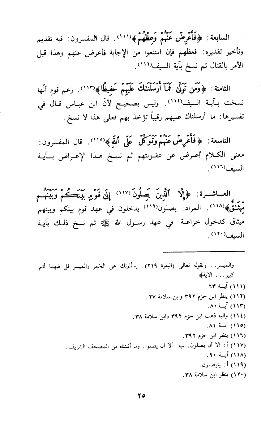 السابعة: {فَأَعْرِضْ عَنْهُمْ وَعِظْهُمْ} 1 قال المفسرون فيه تقديم وتأخير تقديره فعظمهم فإن امتنعوا من الإجابة فأعرض عنهم وهذا قَبْلَ الأَمْرِ بِالْقِتَالِ ثُمَّ نُسِخَ بِآيَةِ السَّيْفِ2.