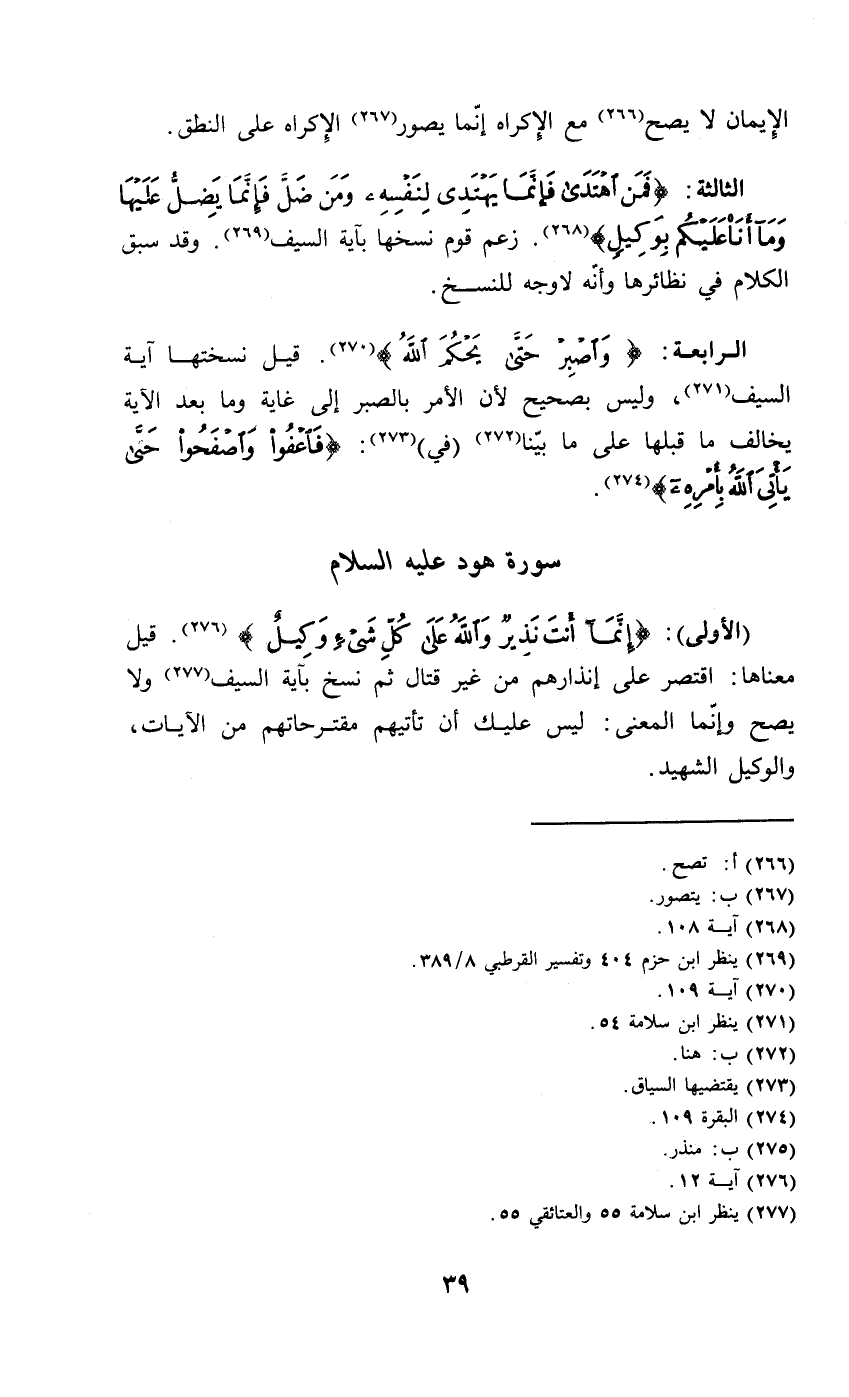 الثالثة: {فَمَنِ اهْتَدَى فَإِنَّمَا يَهْتَدِي لِنَفْسِهِ وَمَنْ ضَلَّ فَإِنَّمَا يَضِلُّ عَلَيْهَا وَمَا أَنَا عَلَيْكُمْ بِوَكِيلٍ} 3 زعم قوم نسخها بآية السيف4 وقد سبق الكلام في نظائرها وأنه لا وجه للنسخ.