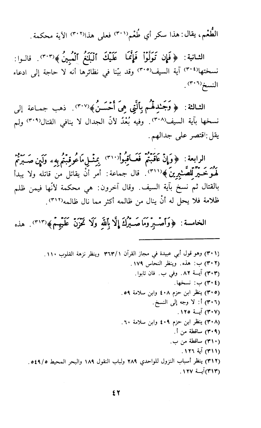 الرابعة: {وَإِنْ عَاقَبْتُمْ فَعَاقِبُوا10 بِمِثْلِ مَا عُوقِبْتُمْ بِهِ وَلَئِنْ صَبَرْتُمْ لَهُوَ خَيْرٌ لِلصَّابِرِينَ} 11 قال جماعة أمر أَنْ يُقَاتِلَ مَنْ قَاتَلَهُ وَلا يَبْدَأُ بِالْقِتَالِ ثم نسخ بآية السيف وقال آخرون هي محكمة لأنها فِيمَنْ ظُلِمَ ظَلامَةً فَلا يَحِلُّ لَهُ أَنْ ينال من ظالمه أكثر مما نال ظالمه12.