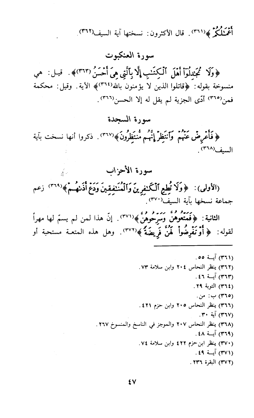 الأولى: {وَلا تُطِعِ الْكَافِرِينَ وَالْمُنَافِقِينَ وَدَعْ أَذَاهُمْ} 9 زعم جماعة نسخها بآية السيف10.