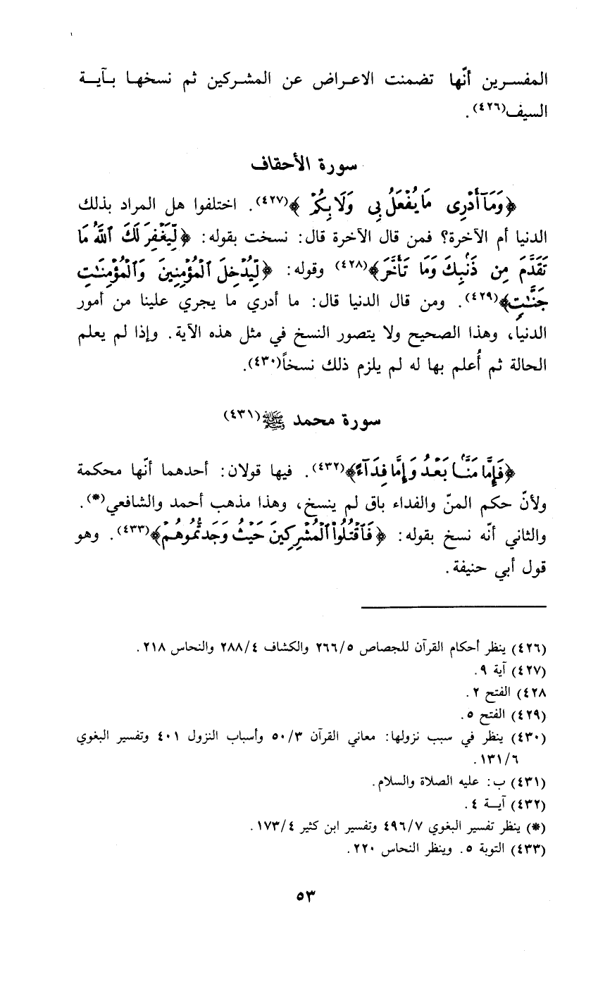 {فإِمَّا مَنّاً بَعْدُ وَإِمَّا فِدَاءً} 7 فيها قولان أحدهما أنها محكمة ولأن الحكم الْمَنِّ وَالْفِدَاءِ بَاقٍ لَمْ يُنْسَخْ وَهَذَا مَذْهَبُ أحمد والشافعي والثاني أنه نسخ بقوله {فَاقْتُلُوا الْمُشْرِكِينَ حَيْثُ وَجَدْتُمُوهُمْ} 8. وهو قول أبي حنيفة