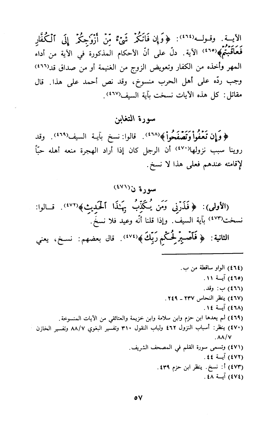 الآيَةُ وَقَوْلُهُ1 {وَإِنْ فَاتَكُمْ شَيْءٌ مِنْ أَزْوَاجِكُمْ إِلَى الْكُفَّارِ فَعَاقَبْتُمْ} 2 الآية دل على أن الأحكام المذكورة في الآية مِنْ أَدَاءِ الْمَهْرِ وَأَخْذِهِ مِنَ الْكُفَّارِ وَتَعْوِيضِ الزَّوْجِ مِنَ الْغَنِيمَةِ أَوْ مِنْ صَدَاقٍ قَدْ3 وجب رده على أهل الحرب منسوخ وقد نص أحمد على هذا قال مقاتل كل هذه الآيات نسخت بآية السيف4.