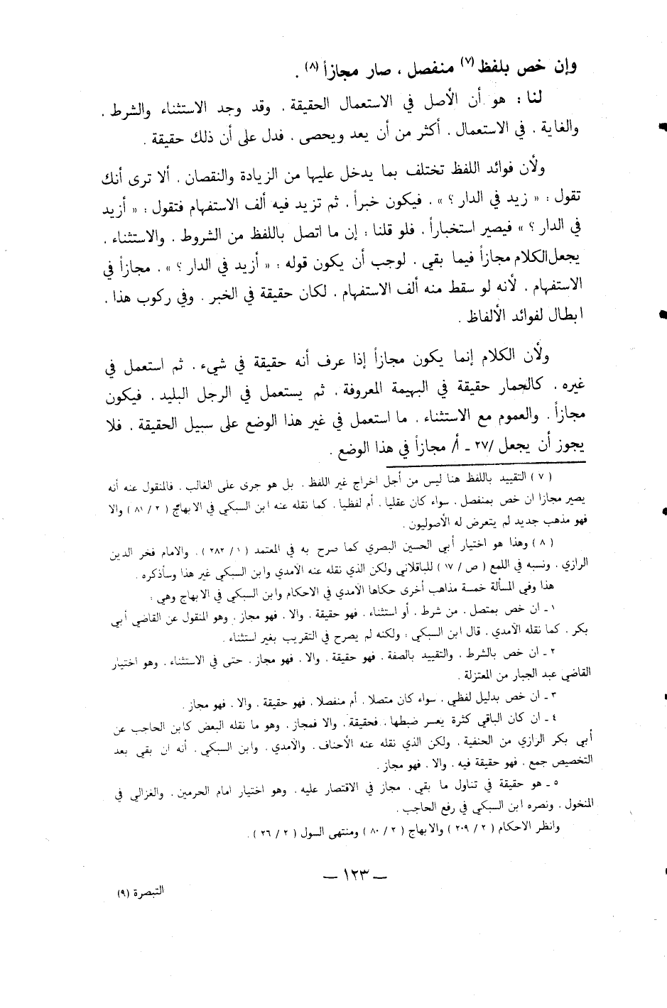 وَلِأَن فَوَائِد اللَّفْظ تخْتَلف بِمَا يدْخل عَلَيْهَا من الزِّيَادَة وَالنُّقْصَان أَلا ترى أَنَّك تَقول زيد فِي الدَّار فَيكون خَبرا ثمَّ تزيد فِيهِ ألف الِاسْتِفْهَام فَتَقول أَزِيد فِي الدَّار فَيصير استخبارا فَلَو قُلْنَا إِن مَا اتَّصل بِاللَّفْظِ من الشُّرُوط وَالِاسْتِثْنَاء يَجْعَل الْكَلَام مجَازًا فِيمَا بَقِي لوَجَبَ أَن يكون قَوْله أَزِيد فِي الدَّار حجازا فِي الِاسْتِفْهَام لِأَنَّهُ لَو سقط مِنْهُ ألف الِاسْتِفْهَام لَكَانَ حَقِيقَة فِي الْخَبَر وَفِي ركُوب هَذَا إبِْطَال لفوائد الْأَلْفَاظ