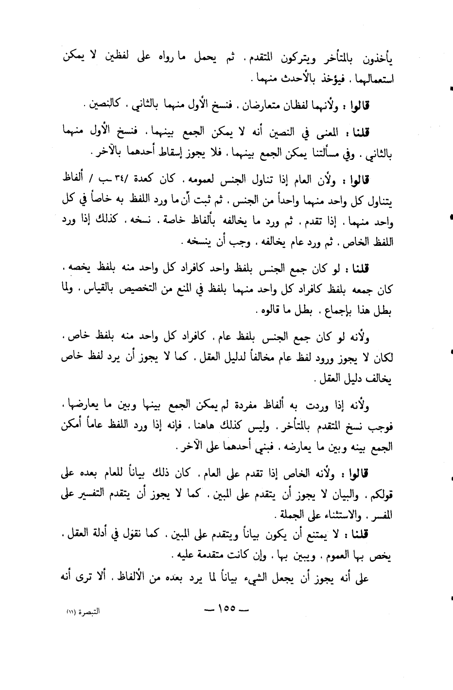 وَلِأَنَّهُ إِذا وَردت بِهِ أَلْفَاظ مُفْردَة لم يكن الْجمع بَينهَا وَبَين مَا يعارضها فَوَجَبَ نسخ الْمُتَقَدّم بالمتأخر وَلَيْسَ كَذَلِك هَاهُنَا فَإِنَّهُ إِذا ورد اللَّفْظ عَاما أمكن الْجمع بَينه وَبَين مَا يُعَارضهُ فَبنِي أَحدهمَا على الآخر