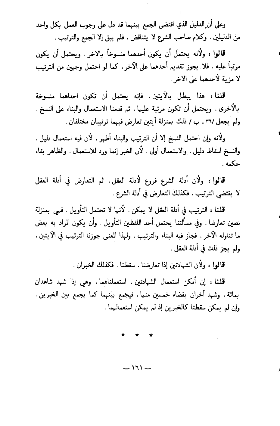 قُلْنَا التَّرْتِيب فِي أَدِلَّة الْعقل لَا يُمكن لِأَنَّهَا لَا تحْتَمل التَّأْوِيل فَهِيَ بِمَنْزِلَة نصين تَعَارضا وَفِي مَسْأَلَتنَا يحْتَمل أحد اللَّفْظَيْنِ التَّأْوِيل وَأَن يكون المُرَاد بِهِ بعض مَا تنَاوله الآخر فَجَاز فِيهِ الْبناء وَالتَّرْتِيب وَلِهَذَا الْمَعْنى جَوَّزنَا التَّرْتِيب فِي الْآيَتَيْنِ وَلم يجز ذَلِك فِي أَدِلَّة الْعقل