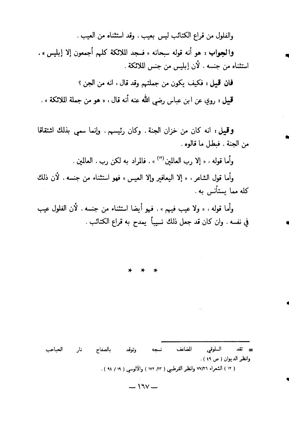 وَالْجَوَاب هُوَ أَنه قَوْله سُبْحَانَهُ {فَسجدَ الْمَلَائِكَة كلهم أَجْمَعُونَ إِلَّا إِبْلِيس} اسْتثِْنَاء من جنسه لِأَن إِبْلِيس من جنس الْمَلَائِكَة