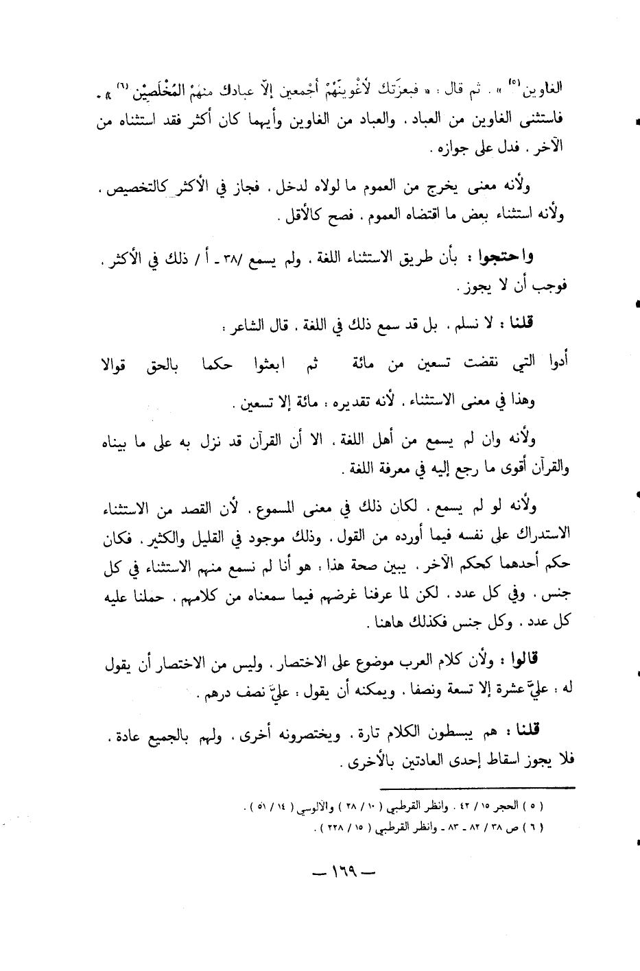 ثمَّ قَالَ {فبعزتك لأغوينهم أَجْمَعِينَ إِلَّا عِبَادك مِنْهُم المخلصين} فاستثنى الغاوين من الْعباد والعباد من الغاوين وَأيهمَا كَانَ أَكثر فقد اسْتَثْنَاهُ من الآخر فَدلَّ على جَوَازه