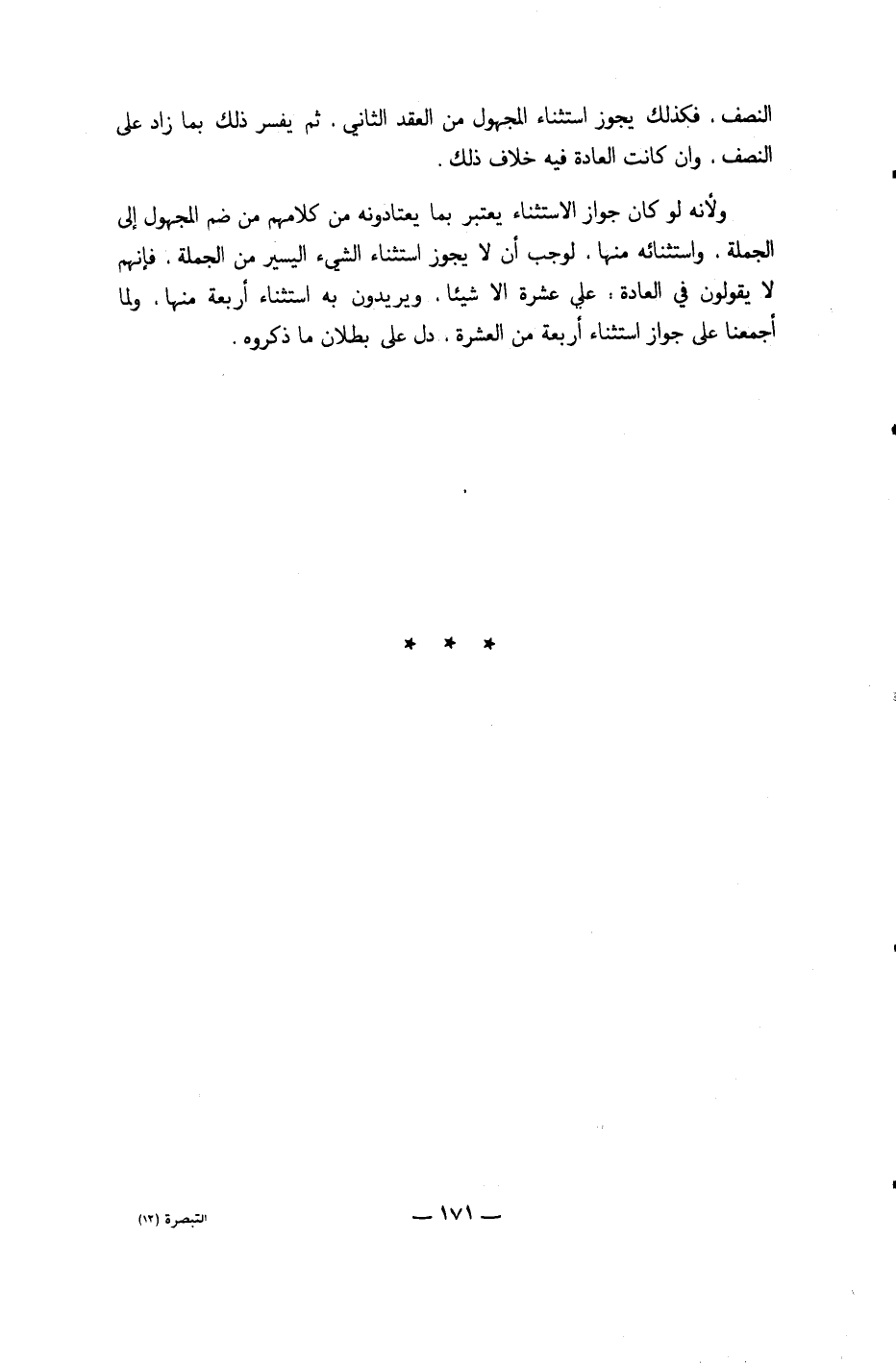 وَلِأَنَّهُ لَو كَانَ جَوَاز الِاسْتِثْنَاء يعْتَبر بِمَا يعتادونه من كَلَامهم من ضم الْمَجْهُول إِلَى الْجُمْلَة واستثنائه مِنْهَا لوَجَبَ أَن لَا يجوز اسْتثِْنَاء الشَّيْء الْيَسِير من الْجُمْلَة فَإِنَّهُم لَا يَقُولُونَ فِي الْعَادة عَليّ عشرَة إِلَّا شَيْئا ويريدون بِهِ اسْتثِْنَاء أَرْبَعَة مِنْهَا وَلما أجمعنا على جَوَاز اسْتثِْنَاء أَرْبَعَة من الْعشْرَة دلّ على بطلَان مَا ذَكرُوهُ