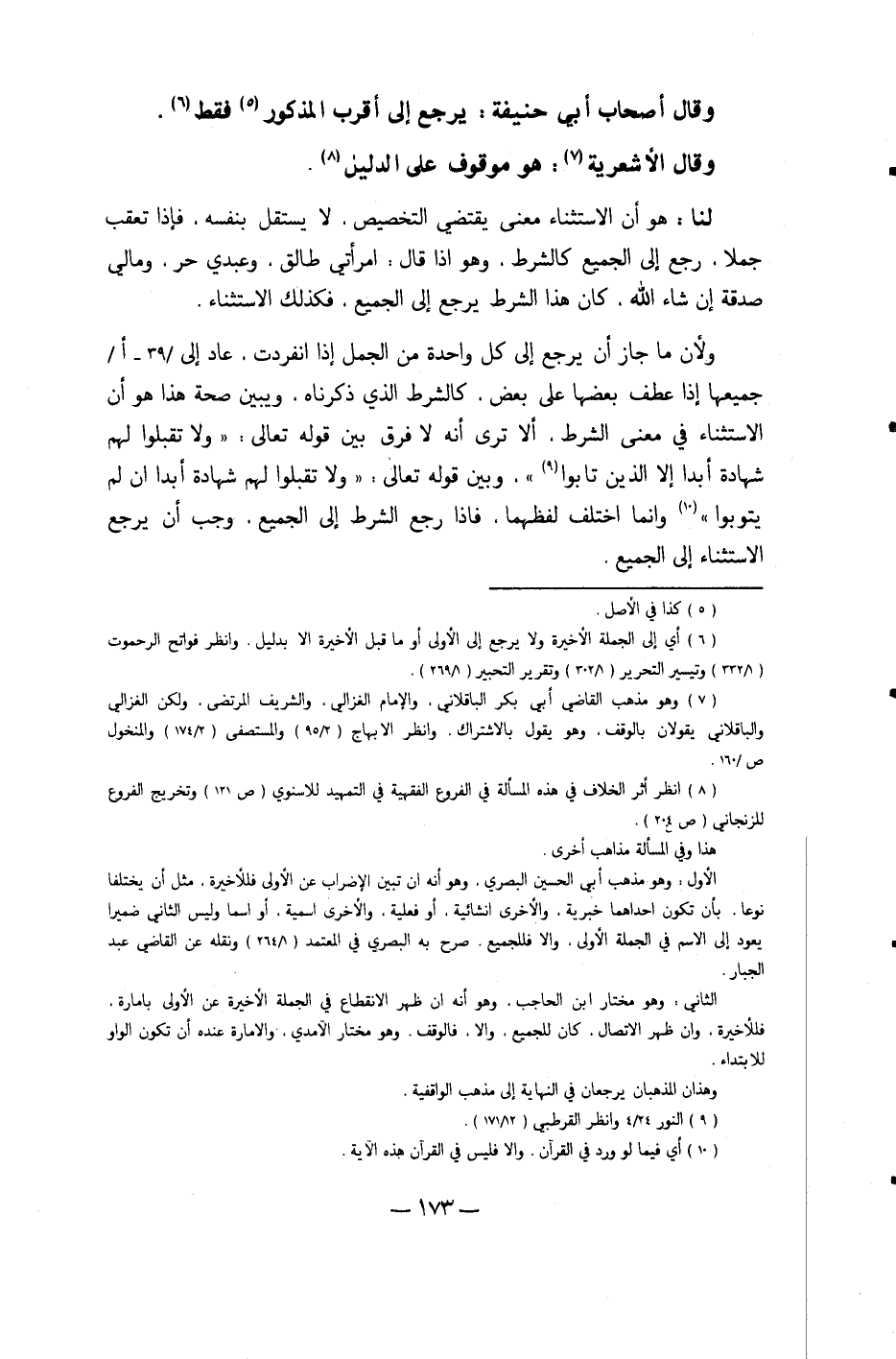 وَلِأَن مَا جَازَ أَن يرجع إِلَى كل وَاحِدَة من الْجمل إِذا انْفَرَدت عَاد إِلَى جَمِيعهَا إِذا عطف بَعْضهَا على بعض كالشرط الَّذِي ذَكرْنَاهُ وَيبين صِحَة هَذَا هُوَ أَن الِاسْتِثْنَاء فِي معنى الشَّرْط أَلا ترى أَنه لَا فرق بَين قَوْله تَعَالَى {وَلَا تقبلُوا لَهُم شَهَادَة أبدا وَأُولَئِكَ هم الْفَاسِقُونَ إِلَّا الَّذين تَابُوا} وَبَين قَوْله تَعَالَى {وَلَا تقبلُوا لَهُم شَهَادَة أبدا وَأُولَئِكَ هم الْفَاسِقُونَ إِلَّا الَّذين تَابُوا} وَإِنَّمَا اخْتلف لَفْظهمَا فَإِذا رَجَعَ الشَّرْط إِلَى الْجَمِيع وَجب أَن يرجع الِاسْتِثْنَاء إِلَى الْجَمِيع