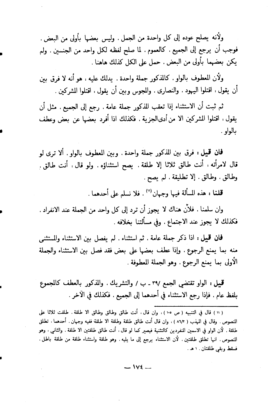 ثمَّ ثَبت أَن الِاسْتِثْنَاء إِذا تعقب الْمَذْكُور جملَة عَامَّة رَجَعَ إِلَى الْجَمِيع مثل أَن يَقُول اقْتُلُوا الْمُشْركين إِلَّا من أدّى الْجِزْيَة فَكَذَلِك إِذا أفرد بَعْضهَا عَن بعض وَعطف بِالْوَاو