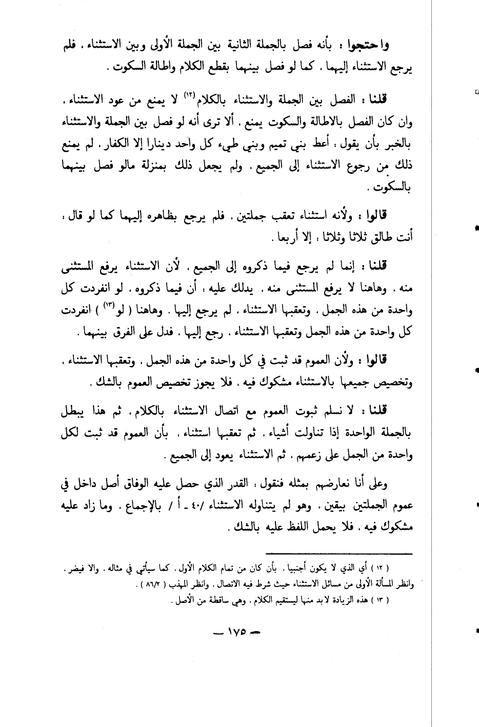 قُلْنَا لَا نسلم ثُبُوت الْعُمُوم مَعَ اتِّصَال الِاسْتِثْنَاء بالْكلَام ثمَّ هَذَا يبطل بِالْجُمْلَةِ الْوَاحِدَة إِذا تناولت أَشْيَاء ثمَّ تعقبها اسْتثِْنَاء بِأَن الْعُمُوم قد ثَبت لكل وَاحِدَة من الْجمل على زعمهم ثمَّ الِاسْتِثْنَاء يعود إِلَى الْجَمِيع
