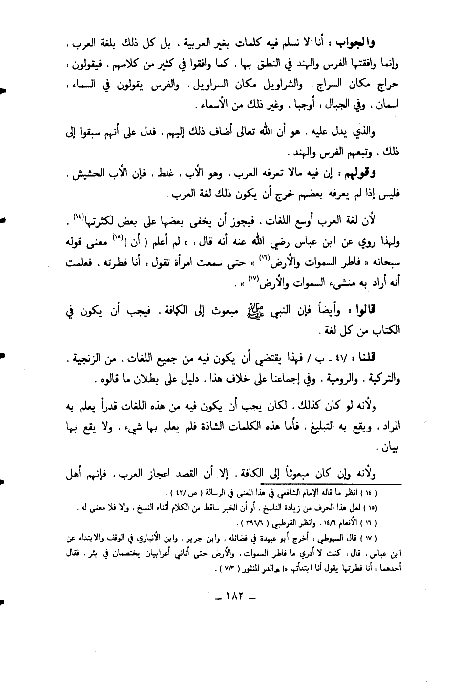 وَالْجَوَاب أَنا لَا نسلم فِيهِ كَلِمَات بِغَيْر الْعَرَبيَّة بل كل ذَلِك بلغَة الْعَرَب وَإِنَّمَا وافقتها الْفرس والهند فِي النُّطْق بهَا كَمَا وافقوا فِي كثير من كَلَامهم فَيَقُولُونَ حراج مَكَان السراج والشراويل مَكَان السَّرَاوِيل وَالْفرس يَقُولُونَ فِي السَّمَاء اسمان وَفِي الْجبَال أوجبا وَغير ذَلِك من الْأَسْمَاء