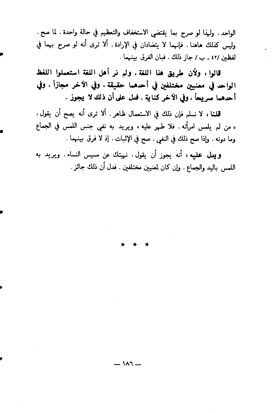 قَالُوا وَلِأَن طَرِيق هَذَا اللُّغَة وَلم نر أهل اللُّغَة استعملوا اللَّفْظ الْوَاحِد فِي مَعْنيين مُخْتَلفين فِي أَحدهمَا حَقِيقَة وَفِي الآخر مجَازًا وَفِي أَحدهمَا صَرِيحًا وَفِي الآخركناية فَدلَّ على أَن ذَلِك لَا يجوز
