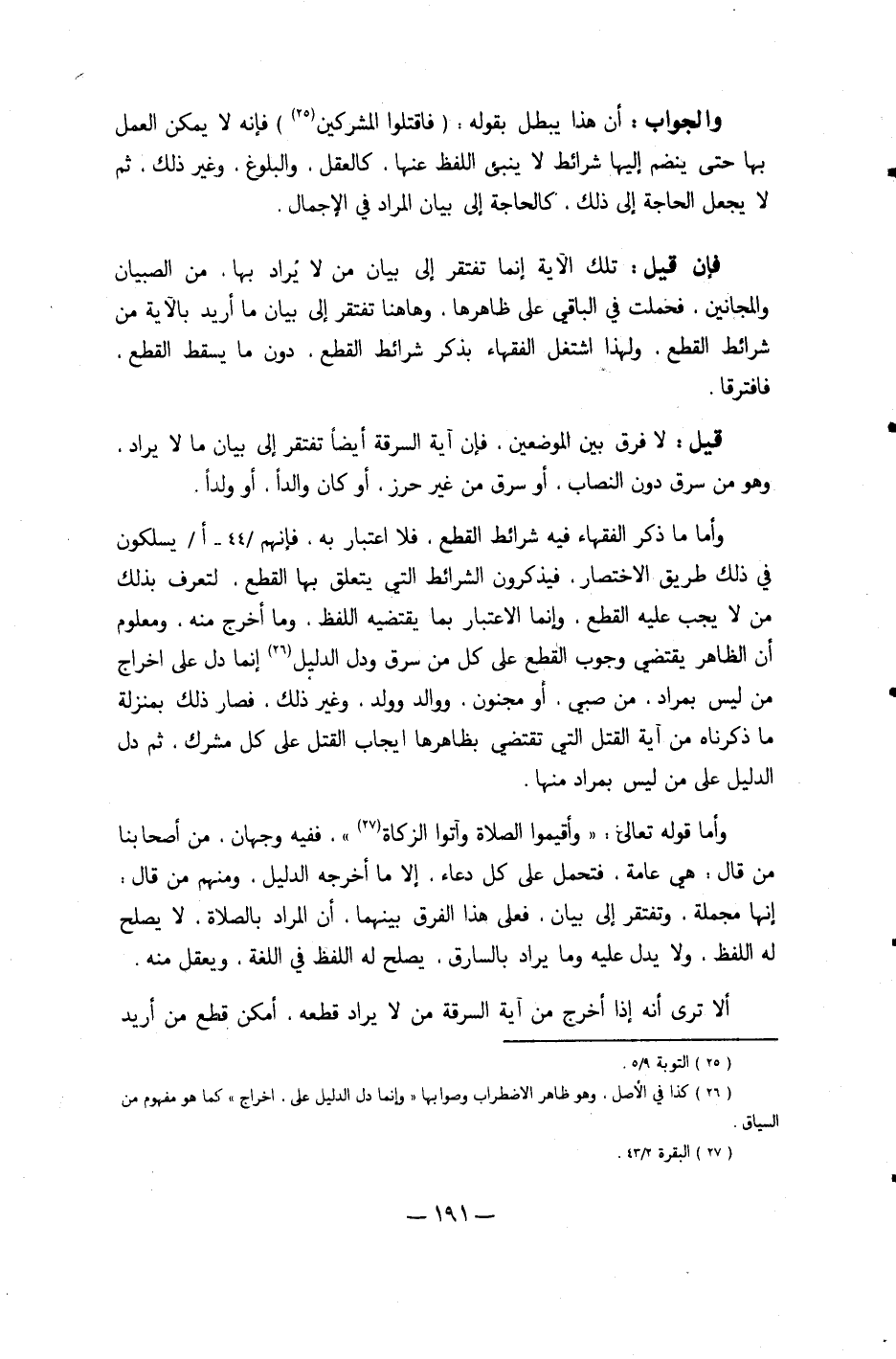 وَأما مَا ذكر الْفُقَهَاء فِيهِ شَرَائِط الْقطع فَلَا اعْتِبَار بِهِ فَإِنَّهُم يسلكون فِي ذَلِك طَرِيق الِاخْتِصَار فَيذكرُونَ الشَّرَائِط الَّتِي يتَعَلَّق بهَا الْقطع لتعرف بذلك من لَا يجب عَلَيْهِ الْقطع وَإِنَّمَا الِاعْتِبَار بِمَا يَقْتَضِيهِ اللَّفْظ وَمَا أخرج مِنْهُ وَمَعْلُوم أَن الظَّاهِر يَقْتَضِي وجوب الْقطع على كل من سرق وَدلّ الدَّلِيل إِنَّمَا دلّ على إِخْرَاج من لَيْسَ بِمُرَاد من صبي أَو مَجْنُون ووالد وَولد وَغير ذَلِك فَصَارَ ذَلِك بِمَنْزِلَة مَا ذَكرْنَاهُ من آيَة الْقَتْل الَّتِي تَقْتَضِي بظاهرها إِيجَاب الْقَتْل على كل مُشْرك ثمَّ دلّ على الدَّلِيل على من لَيْسَ بِمُرَاد مِنْهَا