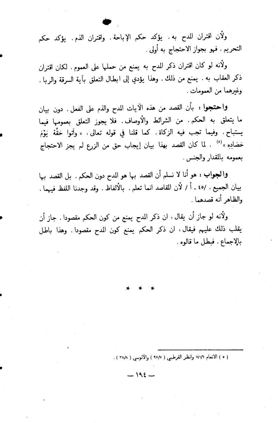 وَاحْتَجُّوا بِأَن الْقَصْد من هَذِه الْآيَات الْمَدْح والذم على الْفِعْل دون بَيَان مَا يتَعَلَّق بِهِ الحكم من الشَّرَائِط والأوصاف فَلَا يجوز التَّعَلُّق بعمومها فِيمَا يستباح وَفِيمَا تجب فِيهِ الزَّكَاة كَمَا قُلْنَا فِي قَوْله تَعَالَى {وَآتوا حَقه يَوْم حَصَاده} لما كَانَ الْقَصْد بِهَذَا بَيَان إِيجَاب حق من الزَّرْع لم يجز الِاحْتِجَاج بِعُمُومِهِ بالمقدار وَالْجِنْس
