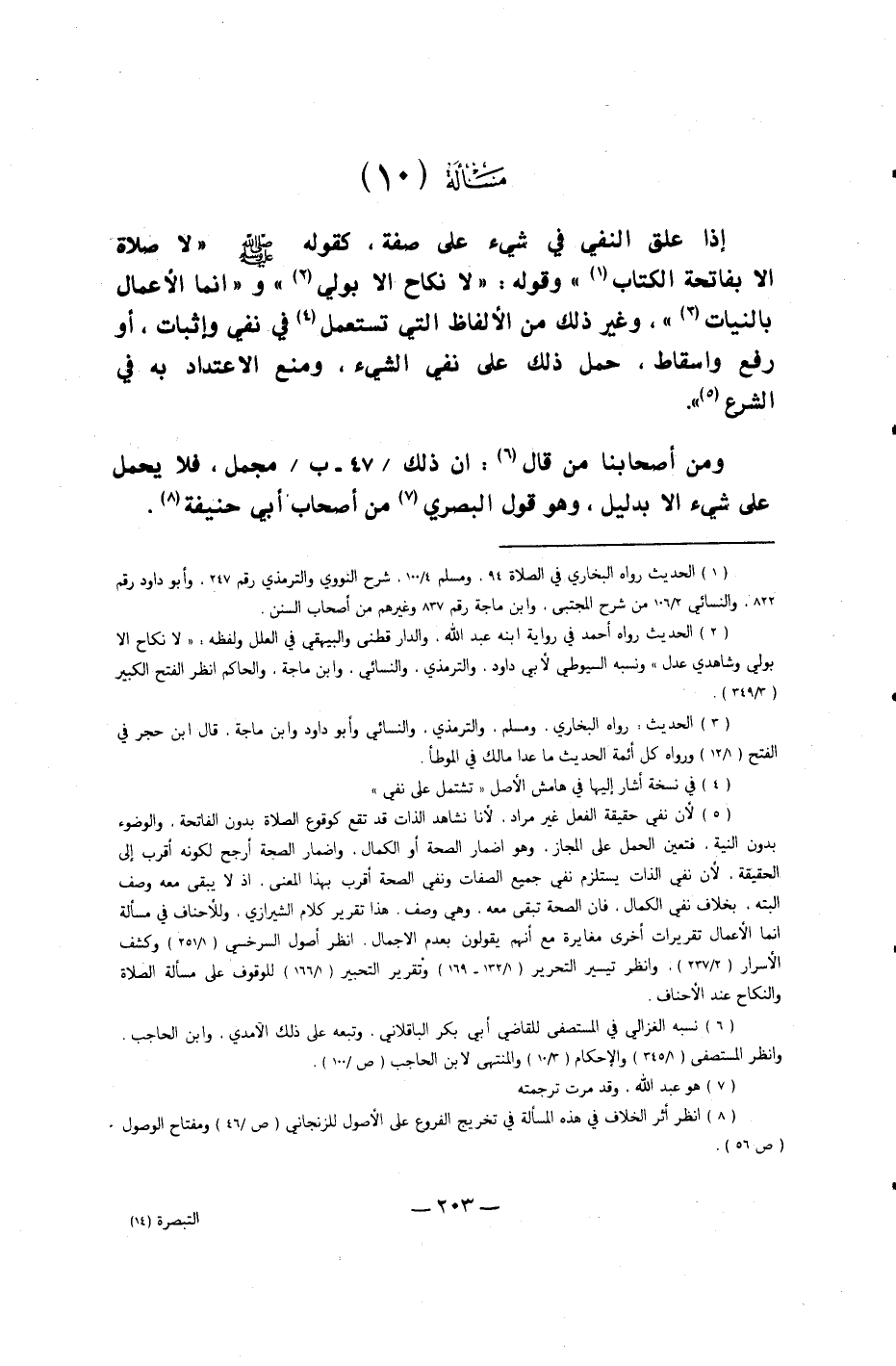 إِذا علق النَّفْي فِي شَيْء على صفة كَقَوْلِه صلى الله عَلَيْهِ وَسلم لَا صَلَاة إِلَّا بِفَاتِحَة الْكتاب وَقَوله لَا نِكَاح إِلَّا بولِي وإِنَّمَا الْأَعْمَال بِالنِّيَّاتِ وَغير ذَلِك من الْأَلْفَاظ الَّتِي تسْتَعْمل فِي نفي وَإِثْبَات أَو رفع وَإِسْقَاط حمل ذَلِك على نفي الشَّيْء وَمنع الِاعْتِدَاد بِهِ فِي الشَّرْع