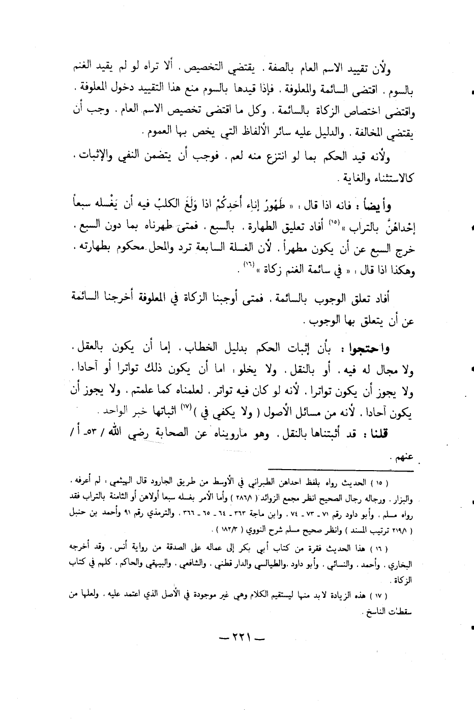 وَأَيْضًا فَإِنَّهُ إِذا قَالَ طهُور إِنَاء أحدكُم إِذا ولغَ الْكَلْب فِيهِ أَن يغسلهُ سبعا إِحْدَاهُنَّ بِالتُّرَابِ أَفَادَ تَعْلِيق الطَّهَارَة بالسبع فَمَتَى طهرناه بِمَا دون السَّبع خرج السَّبع عَن أَن يكون مطهرا لِأَن الغسلة السَّابِعَة ترد وَالْمحل مَحْكُوم بِطَهَارَتِهِ وَهَكَذَا إِذا قَالَ فِي سَائِمَة الْغنم زَكَاة