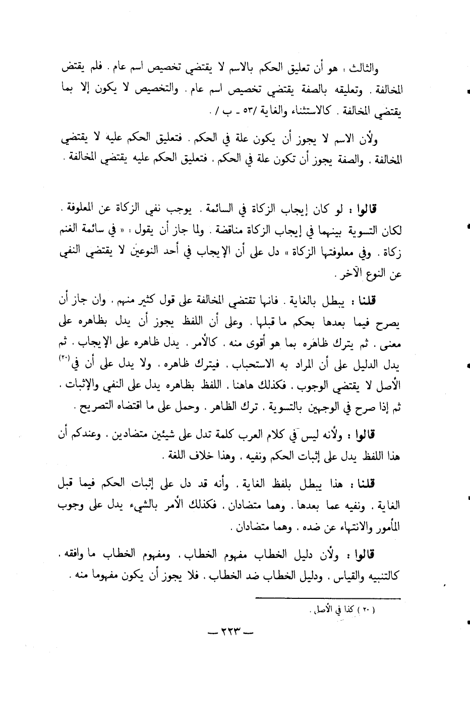قَالُوا لَو كَانَ إِيجَاب الزَّكَاة فِي السَّائِمَة يُوجب نفي الزَّكَاة عَن المعلوفة لَكَانَ التَّسْوِيَة بَينهمَا فِي إِيجَاب الزَّكَاة مناقضة وَلما جَازَ أَن يَقُول فِي سَائِمَة الْغنم زَكَاة وَفِي معلوفتها الزَّكَاة دلّ على أَن الْإِيجَاب فِي أحد النَّوْعَيْنِ لَا يَقْتَضِي النَّفْي عَن النَّوْع الآخر